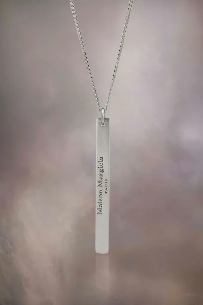 Elaborado en plata esterlina semipulida, el collar presenta un colgante largo y delgado grabado con el logotipo de Maison Margiela.