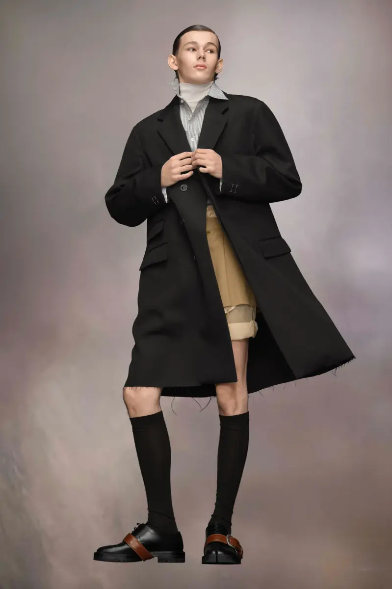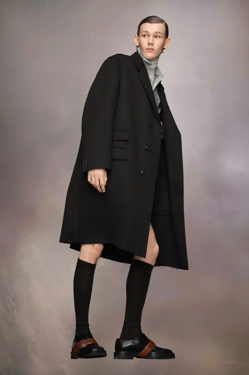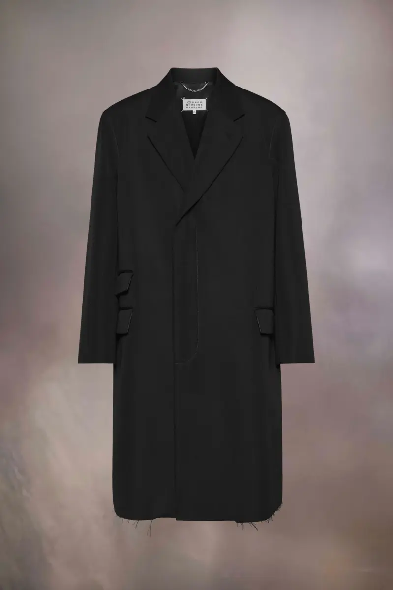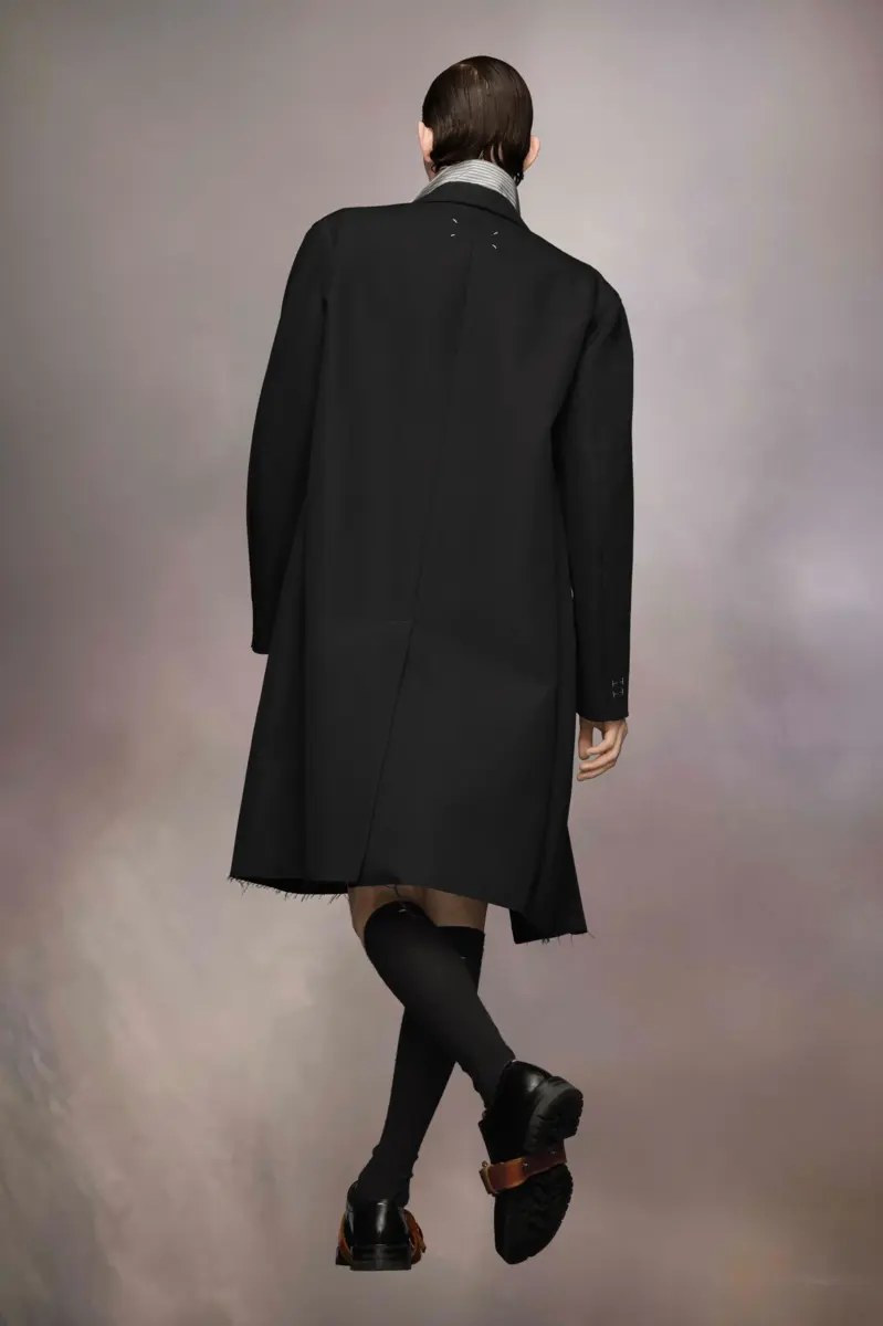 En una mezcla de lana virgen y seda con bordes sin rematar, este abrigo largo presenta costuras en proceso para un estilo informal. Se completa con cuello con muescas y bolsillos asimétricos. Las cuatro puntadas, insignia de Maison Margiela, aparecen en la espalda; lo opuesto a una etiqueta.
