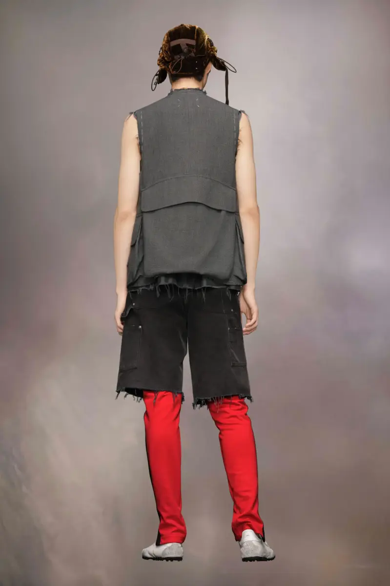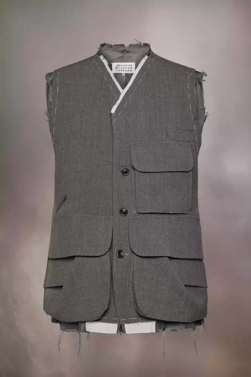 Ejemplo del enfoque de trabajo en progreso de la Maison, esta chaqueta sin mangas está confeccionada en lana y presenta bordes desgastados y pespuntes. Con un diseño de botonadura sencilla y cuello en V, la chaqueta tiene un enfoque utilitario con múltiples bolsillos asimétricos, incluyendo un gran bolsillo con solapa en la espalda. Las cuatro puntadas, características de Maison Margiela, aparecen en la espalda. Lo opuesto a una etiqueta.