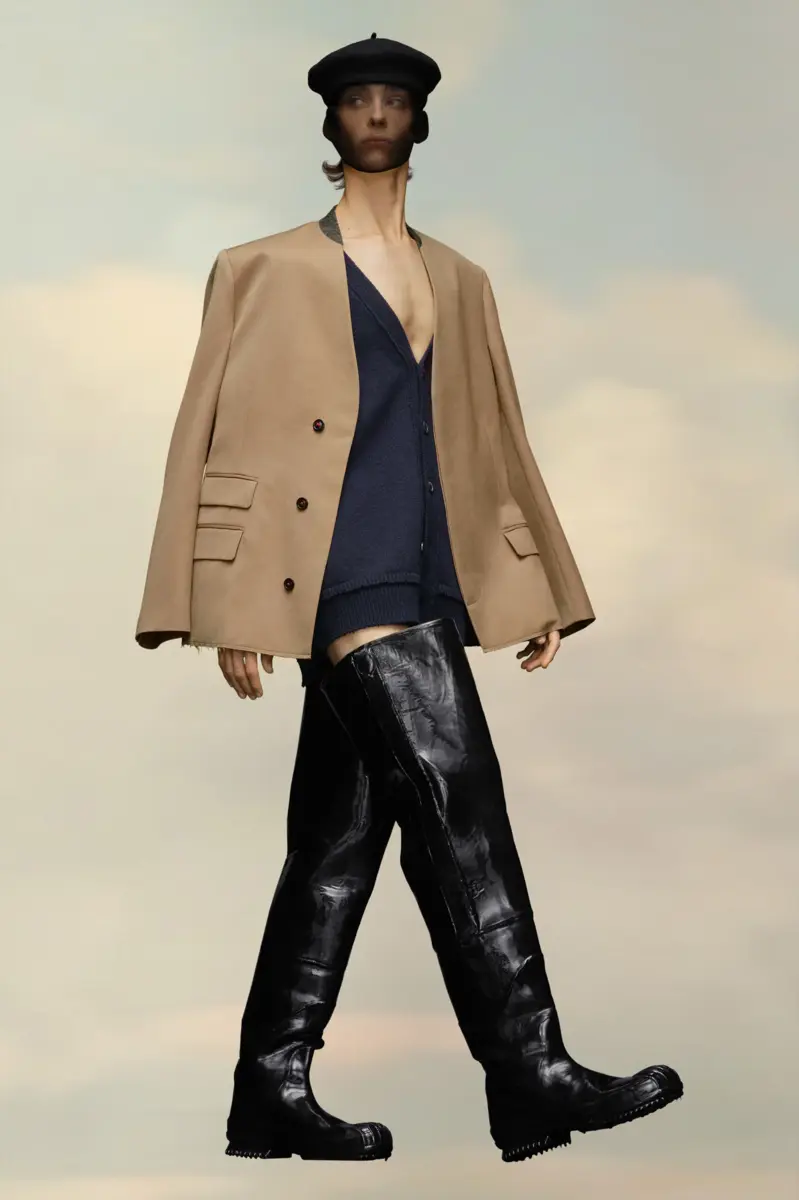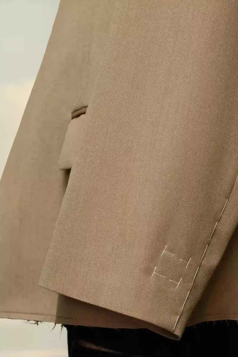 Blazer de lana con cuello mao y bolsillos asimétricos. Presenta cuello en contraste, puños con efecto memoria y cuatro puntadas blancas en la espalda que muestran la firma de la Maison: lo opuesto a una etiqueta. Exterior: 100 % lana. Forro: 65 % acetato, 35 % viscosa-rayón. Forro de los bolsillos: 100 % algodón. Chaqueta sin cuello. Escote en Y. Cierre frontal con botones ocultos. Bolsillos delanteros con solapa. Costura de hilván en puños y hombros. Bajo sin rematar. Cuatro puntadas en la espalda. Hecho en Italia.