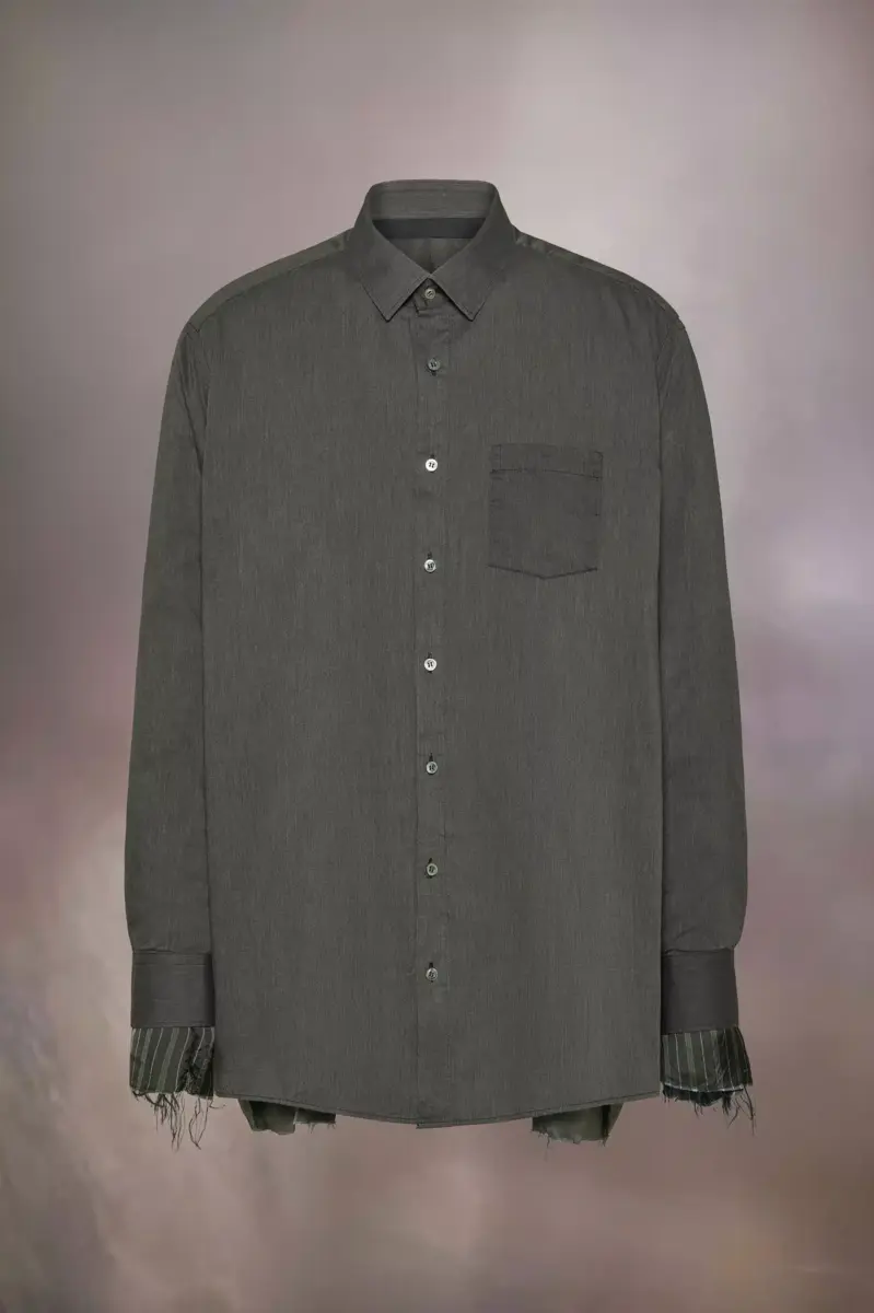 La chaqueta explora el concepto de anonimato del forro de la Maison, con una sensación inacabada al revés, que insinúa la fluidez del proceso creativo. Las mangas a rayas con bordes sin rematar contrastan con los paneles frontales en capas, que se completan con tapeta abotonada, cuello clásico y bolsillos. Las cuatro puntadas, la firma de Maison Margiela, aparecen en la espalda. Lo opuesto a una etiqueta.