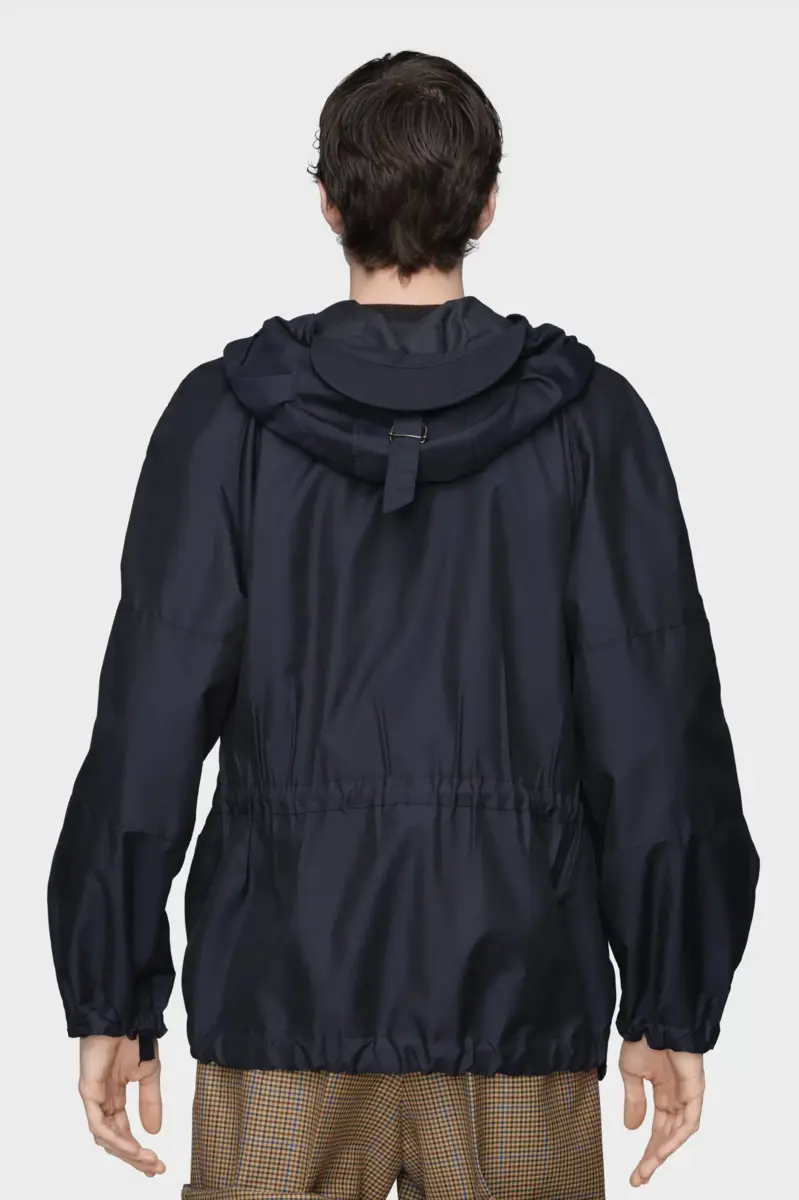 Con una silueta relajada, esta chaqueta presenta cuello alto y bolsillos con solapa, inspirados en los códigos de la ropa de abrigo práctica para el campo. La técnica «Memoria de los pliegues» conserva las marcas del uso, aportando una textura sutil y un aspecto desgastado. Las cuatro puntadas, el sello distintivo de Maison Margiela, aparecen en la espalda; lo opuesto a una etiqueta.
