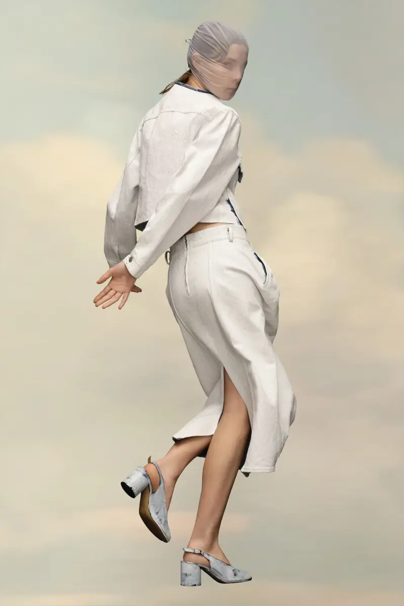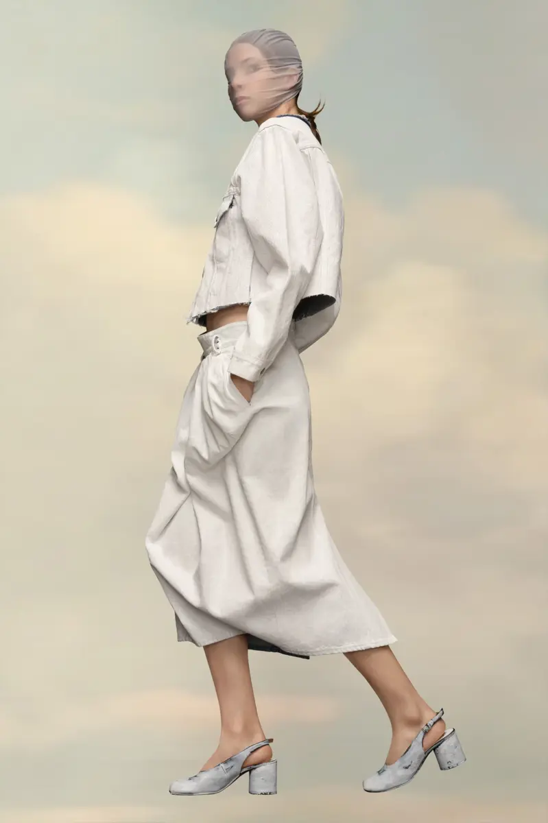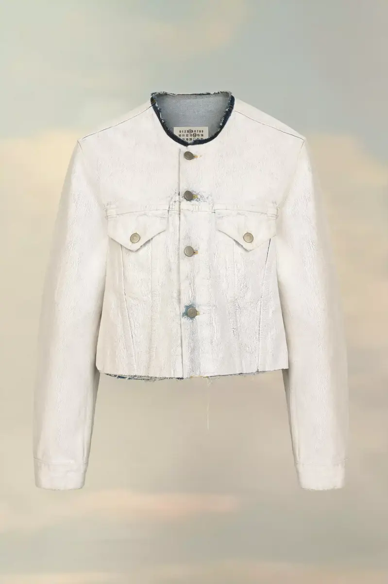 Esta chaqueta vaquera ajustada sin cuello tiene un corte a la cintura y un efecto blanco agrietado. Luce herrajes metálicos clásicos y detalles de costuras. El cuello en contraste tiene un acabado sin rematar y la espalda luce las cuatro puntadas blancas, que representan la firma de la Maison: lo contrario de una etiqueta.