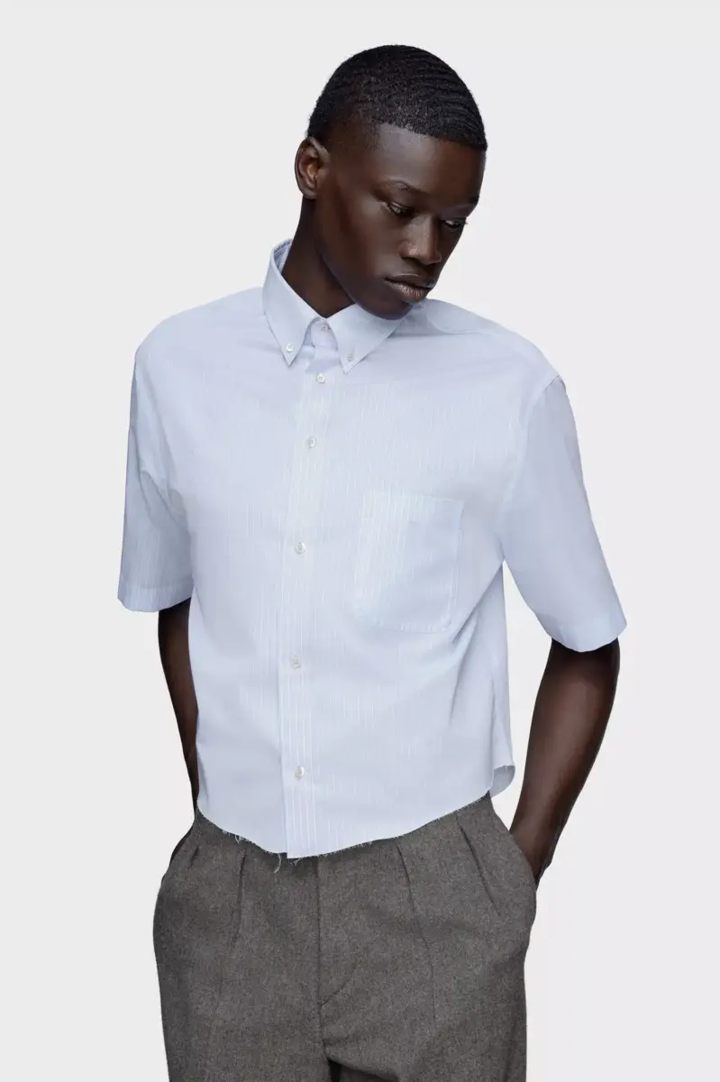 Esta camisa de manga corta tiene un largo corto y está diseñada con un cuello clásico y un bolsillo invertido Decortiqué en el pecho. El bajo sin rematar aporta un sutil toque de deconstrucción, ofreciendo una versión discretamente deshecha de la camisa de diario. Las cuatro puntadas, el sello distintivo de Maison Margiela, aparecen en la espalda; lo opuesto a una etiqueta.