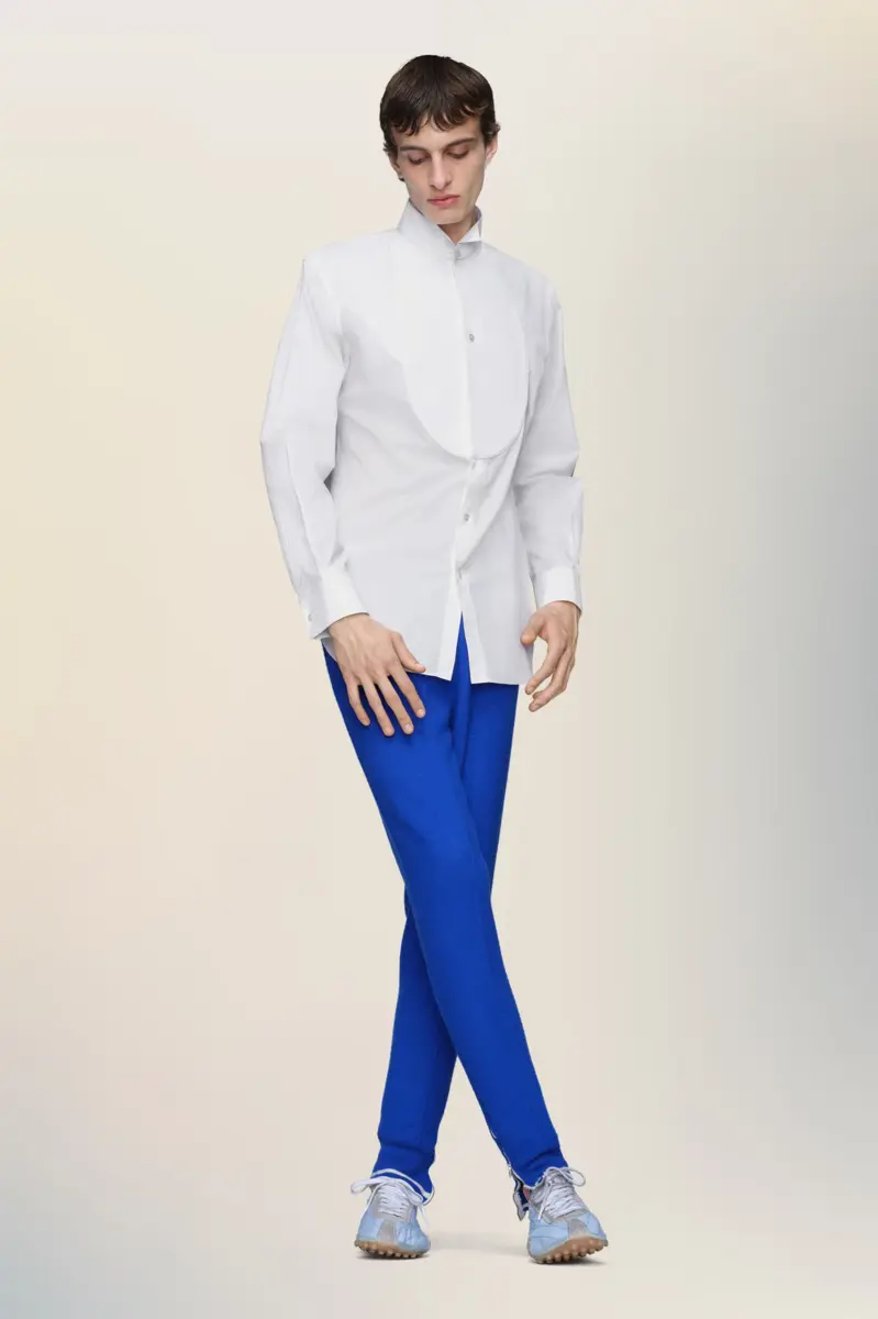 Confeccionada en popelina de algodón fresco, esta camisa formal presenta una pechera estructurada y cuello en punta, en referencia a los códigos de vestimenta tradicionales. Las cuatro puntadas, el sello distintivo de Maison Margiela, aparecen en la espalda; lo opuesto a una etiqueta.