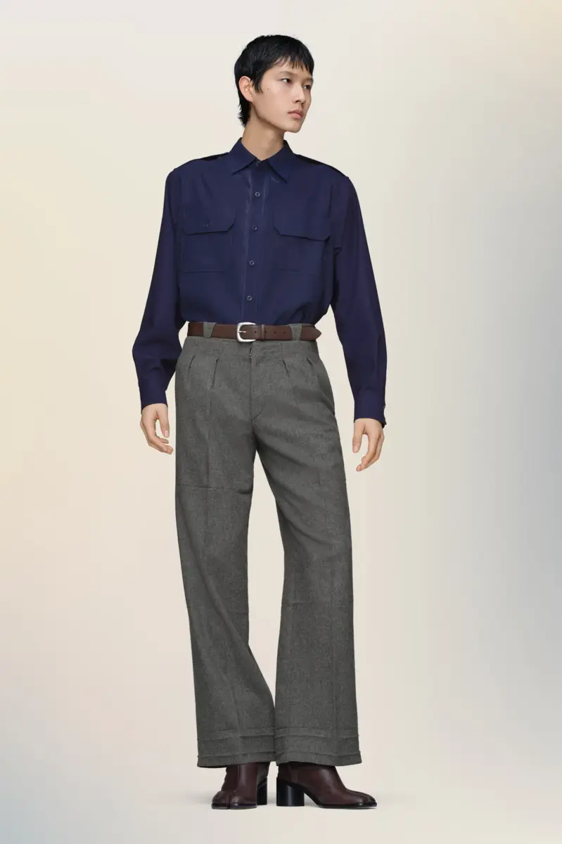 Definida por sus bolsillos de parche con solapa, uno de ellos con costuras interrumpidas, esta camisa demuestra la atención de la Maison al proceso de confección. Las charreteras en los hombros insinúan códigos de uniforme, mientras que el tejido se transforma mediante la técnica Pressed to Death: un tratamiento de calor, presión y pintura a mano. Las cuatro puntadas, la firma de Maison Margiela, aparecen en la espalda; lo opuesto a una etiqueta.