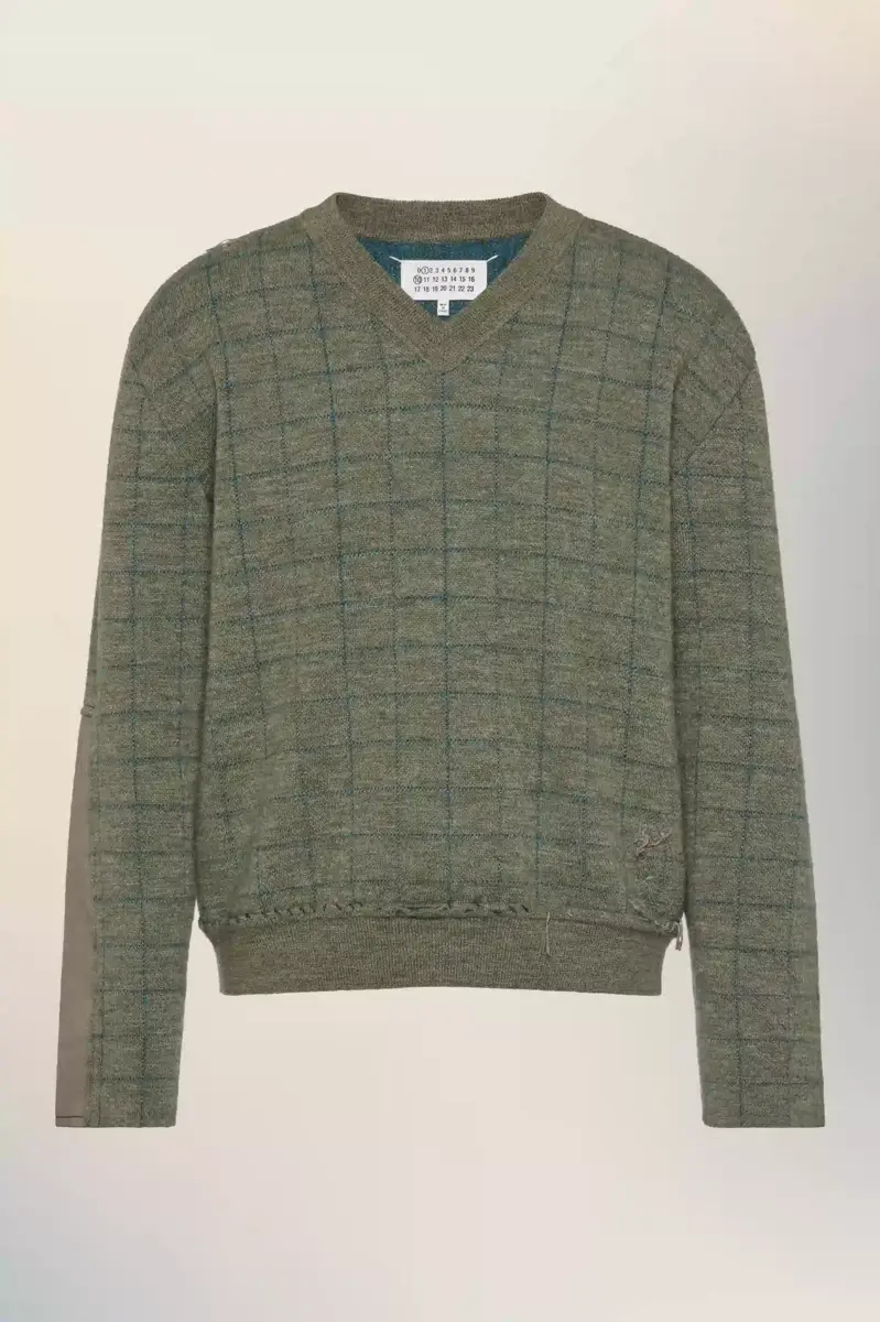 Con un diseño de cuadros texturizados, este jersey de cuello en V refleja la reinterpretación de los arquetipos rurales de la colección. Tejido con el método Charles patching (una técnica inspirada en la del rey Carlos remendando su propia ropa), presenta costuras de reparación visibles y un acabado irregular en el bajo, una prenda moldeada por el tiempo y el uso. Las cuatro puntadas, el sello distintivo de Maison Margiela, aparecen en la espalda; lo opuesto a una etiqueta.