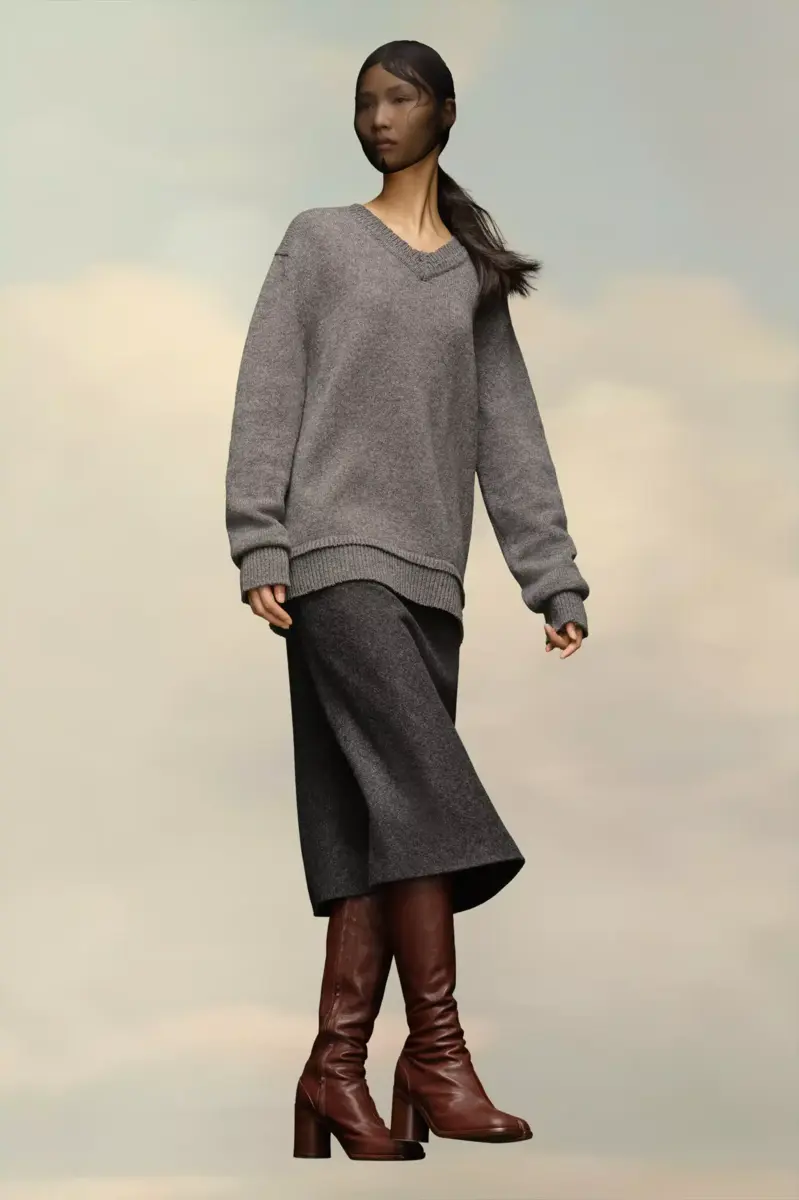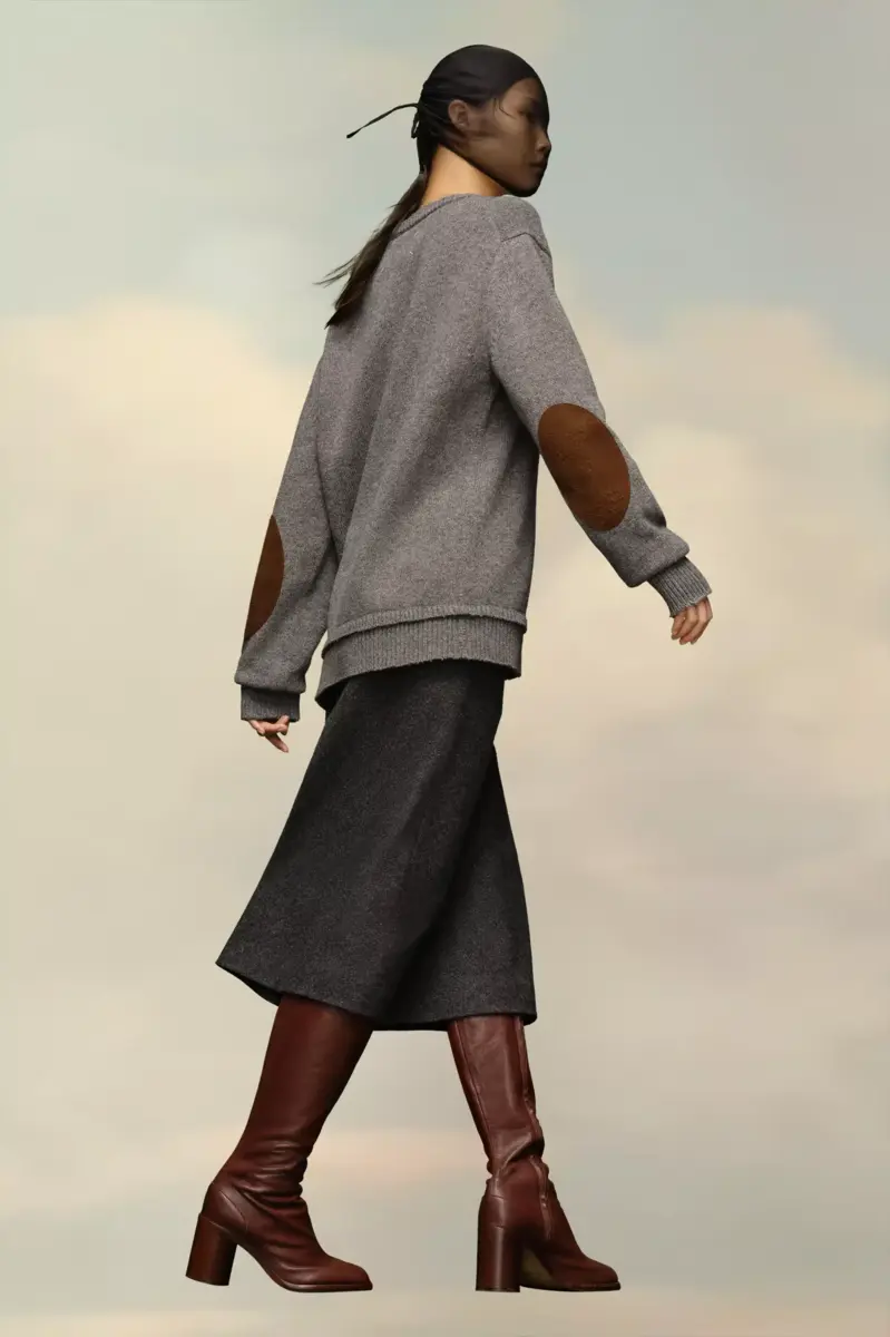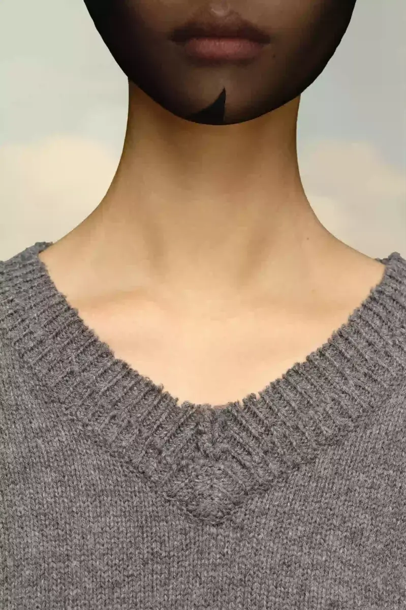 Este jersey de punto con cuello en V, mangas largas y ribetes acanalados presenta coderas del mismo tono. En la espalda, cuatro puntadas blancas indican la firma de la Maison: lo opuesto a una etiqueta. Galga 5. Composición: 46 % lana, 31 % lino, 23 % algodón. Cuello en V. Ribetes acanalados. Coderas. Detalles decorativos. Cuatro puntadas en la espalda. Galga 5. Hecho en Italia.
