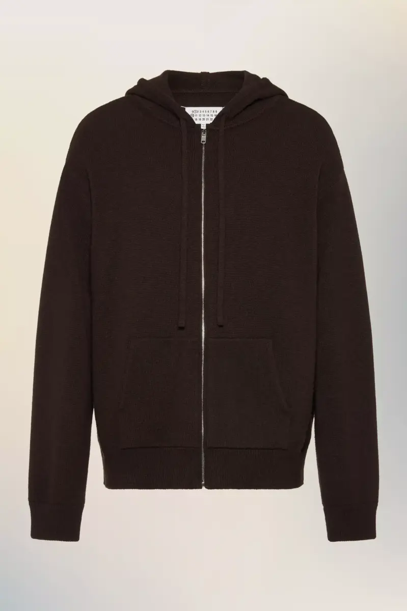 Este suave suéter de cachemira con capucha y cremallera presenta un corte holgado. El dobladillo y los puños acanalados enmarcan la silueta, mientras que los bolsillos de parche y la capucha con cordón rematan el diseño. Las cuatro puntadas, el sello distintivo de Maison Margiela, aparecen en la espalda; lo opuesto a una etiqueta.