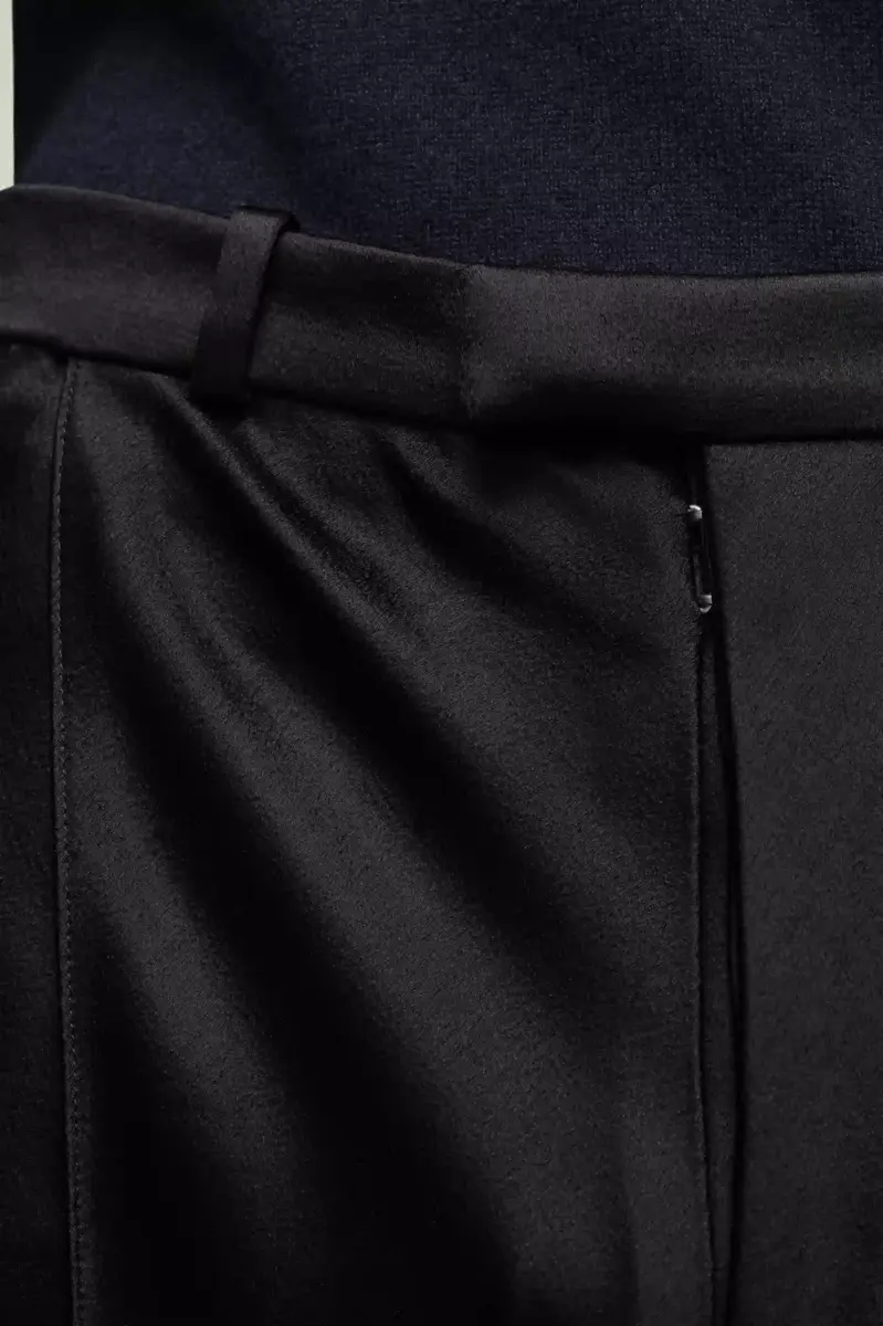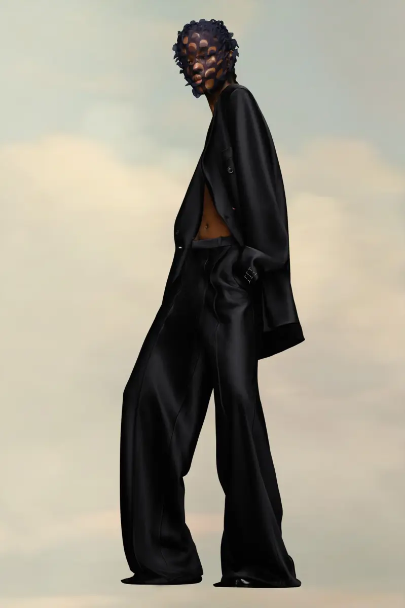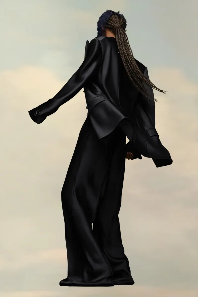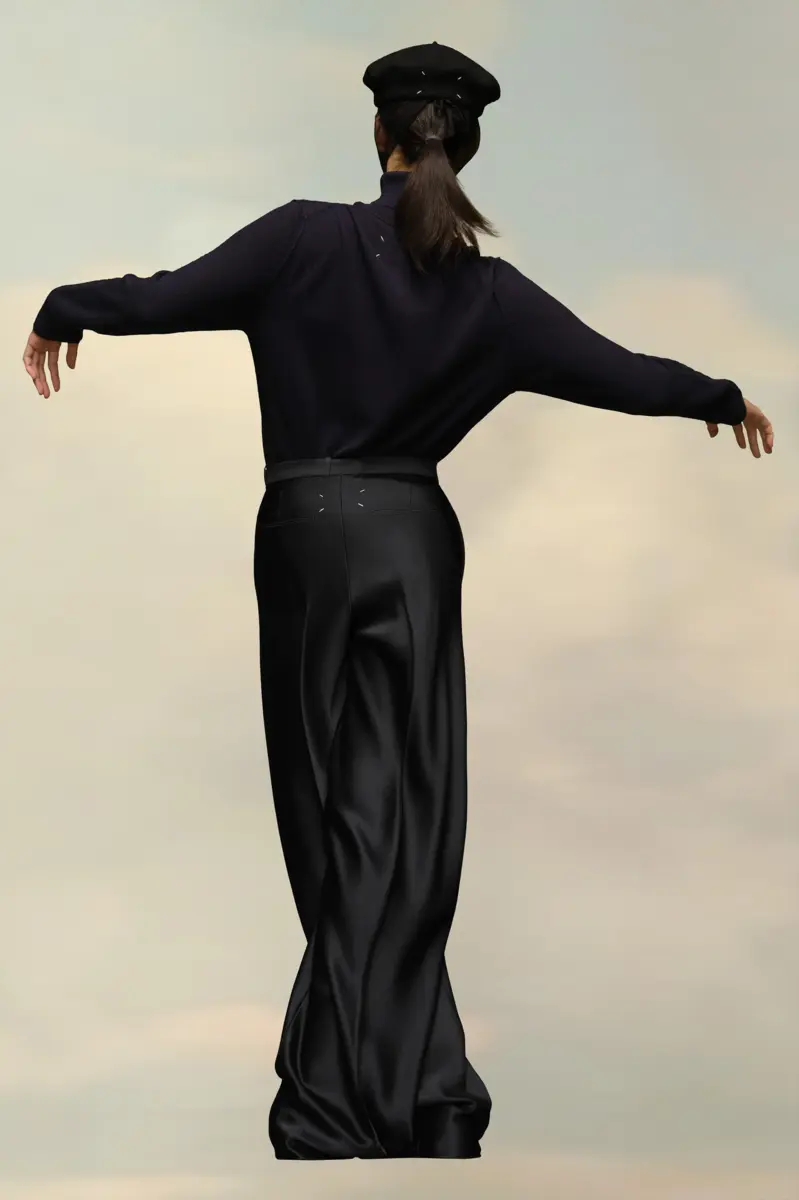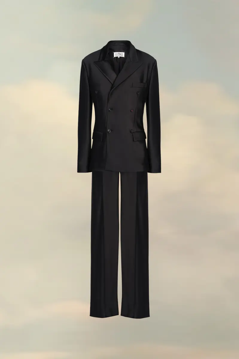 Confeccionado en satén, este traje de dos piezas incluye una americana cruzada con cuello de muesca y pantalones oversize. Los puños muestran la memoria conceptual de la Maison y luce un botón M asimétrico. En la espalda, las cuatro puntadas blancas indican la mano de la Maison: lo opuesto a una etiqueta.