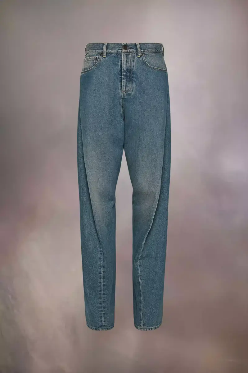Los vaqueros presentan paneles cortados en diagonal para un efecto de costura torcida. Se completan con cinco bolsillos, el gancho de Margiela y el parche del logo Memory Of. Las cuatro puntadas, la firma de Maison Margiela, aparecen en la espalda; lo opuesto a una etiqueta.