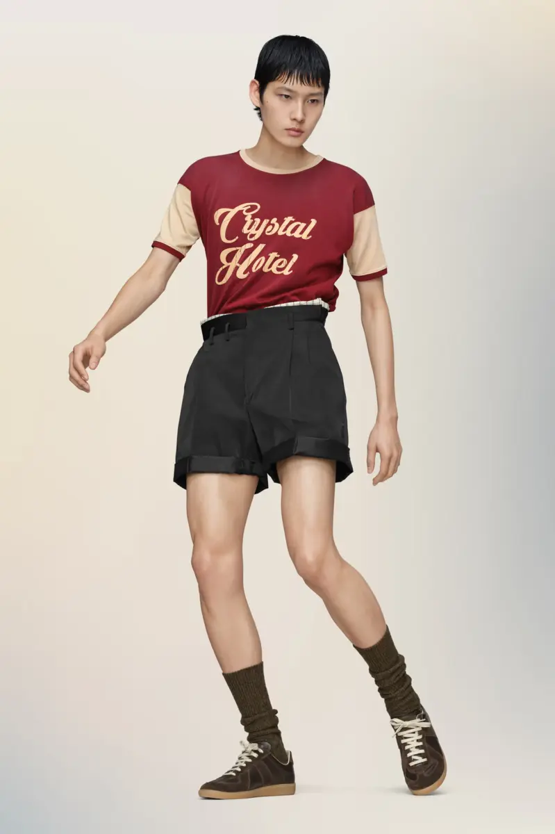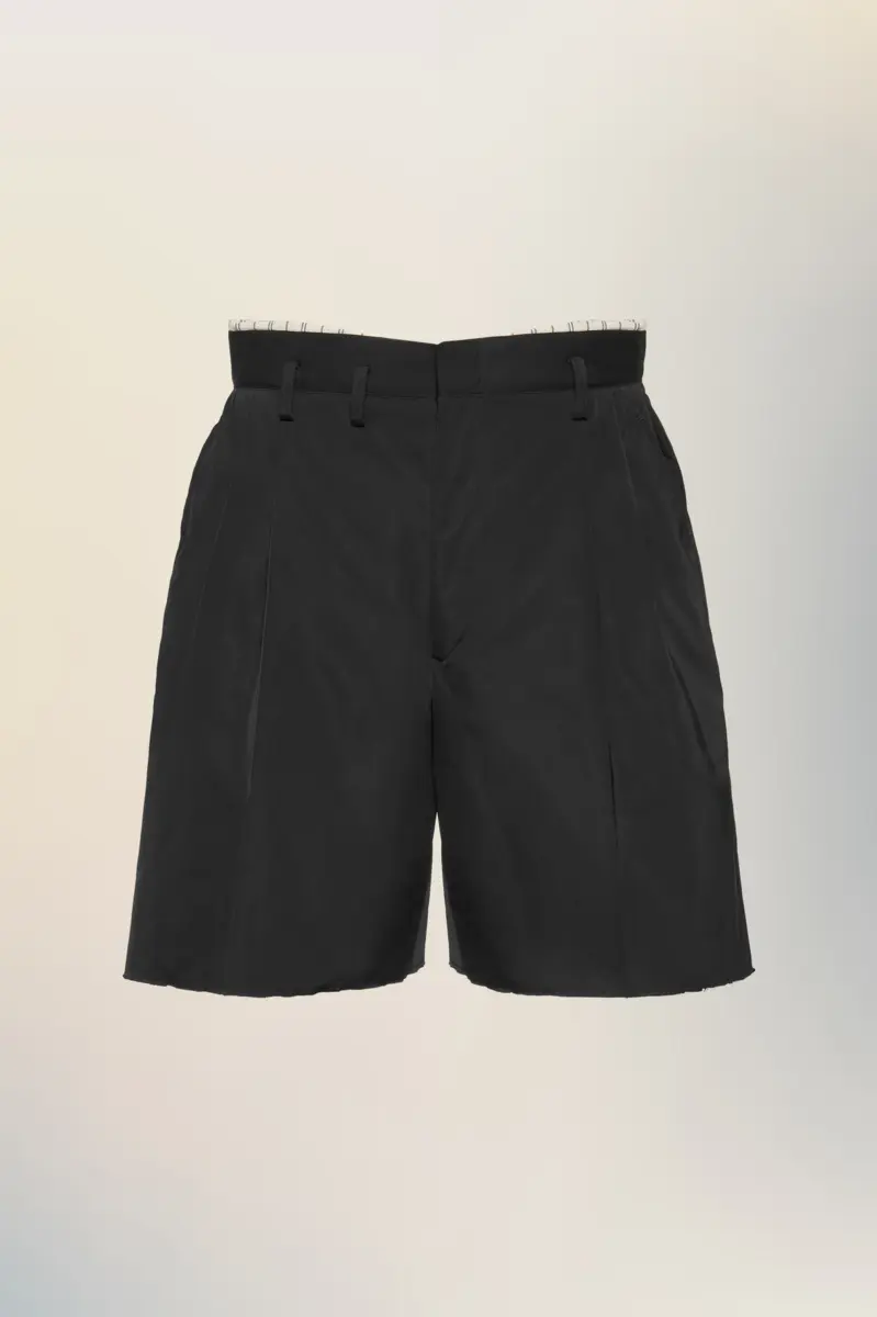 Confeccionados con pliegues impecables y dobladillos sin rematar, estos pantalones cortos ofrecen una sutil versatilidad. Un forro a rayas queda parcialmente expuesto en la cinturilla, una revelación intencionada que refleja la apuesta de la Maison por el anonimato del forro. Las cuatro puntadas, el sello distintivo de Maison Margiela, aparecen en la espalda; lo opuesto a una etiqueta.