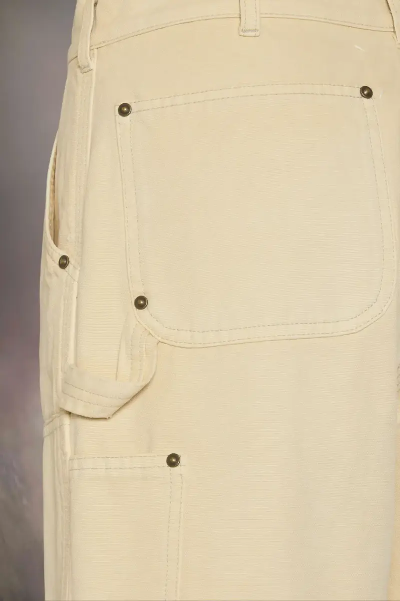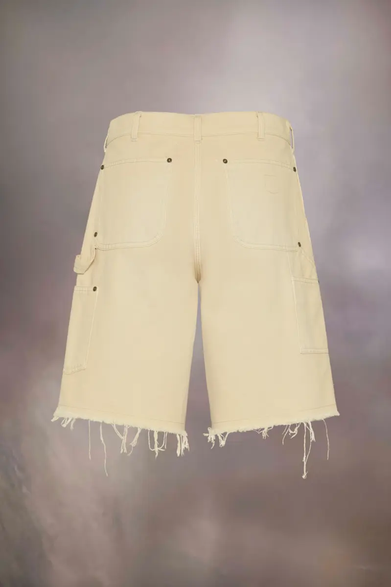 Los shorts vaqueros presentan bordes deshilachados y desgastados, y detalles de tachuelas. Los bolsillos, incluidos los recortados en el lateral, se combinan con una trabilla para un aspecto práctico. Están diseñados con trabillas para cinturón y cierre de gancho de Margiela. Las cuatro puntadas, el sello distintivo de Maison Margiela, aparecen en la espalda; lo opuesto a una etiqueta.