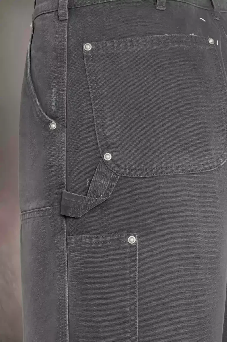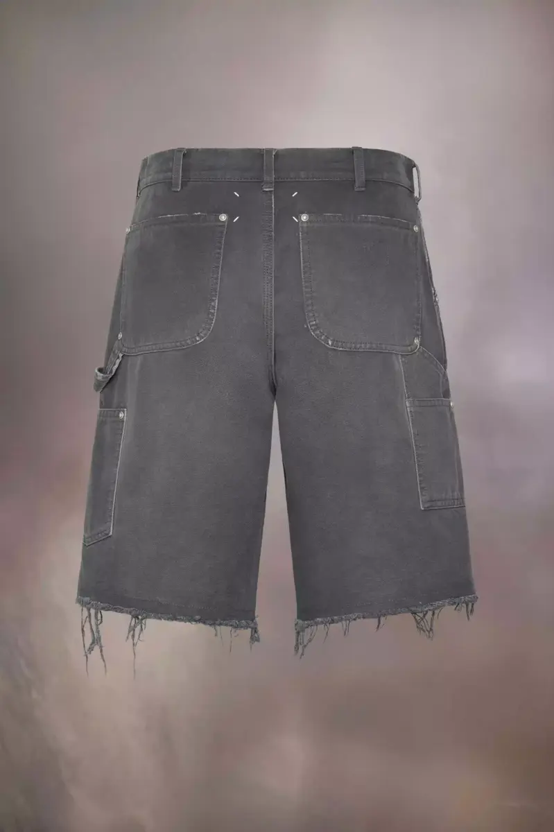 Los shorts vaqueros presentan bordes deshilachados y desgastados, y detalles de tachuelas. Los bolsillos, incluidos los recortados en el lateral, se combinan con una trabilla para un aspecto práctico. Están diseñados con trabillas para cinturón y cierre de gancho de Margiela. Las cuatro puntadas, el sello distintivo de Maison Margiela, aparecen en la espalda; lo opuesto a una etiqueta.