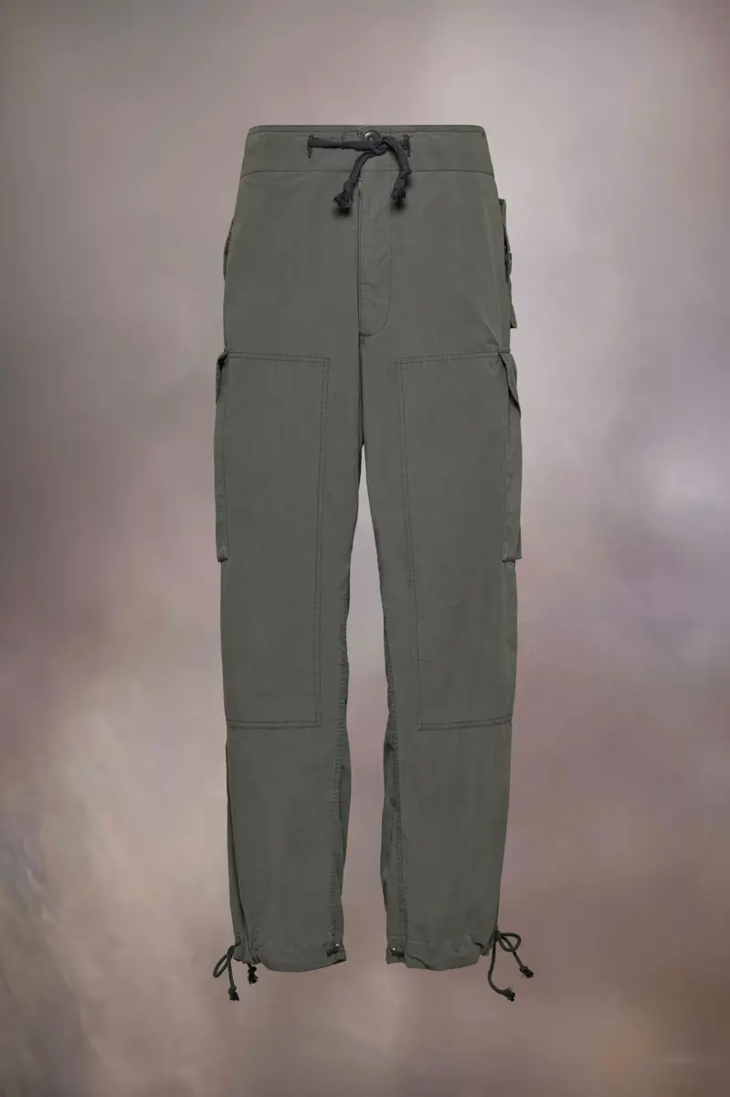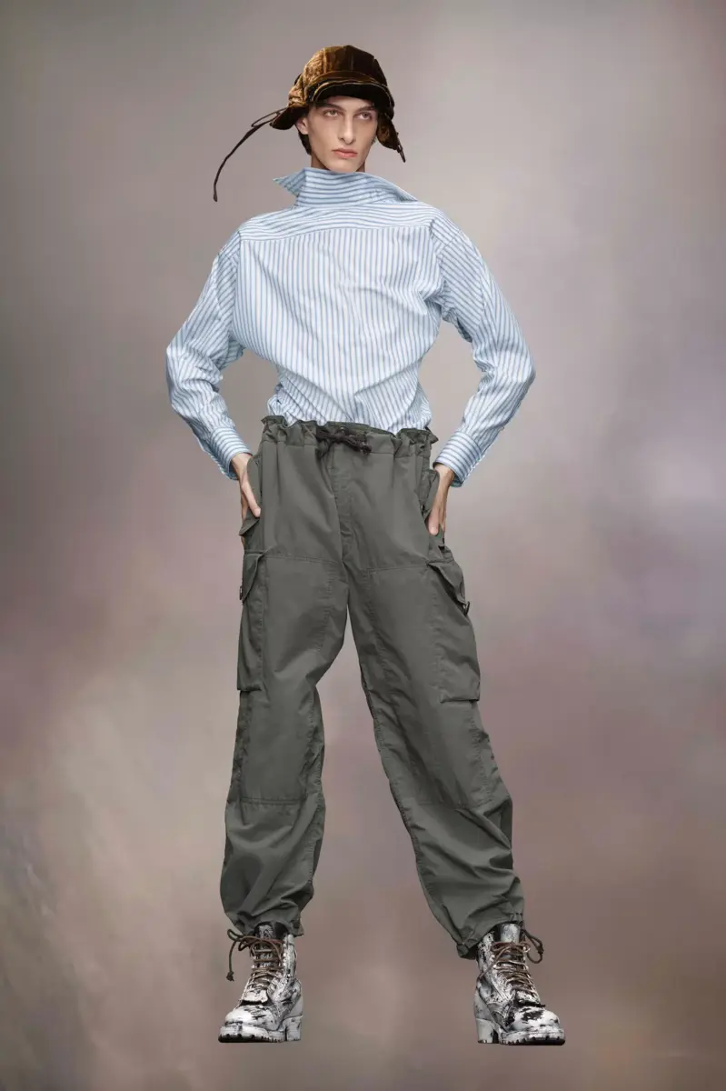 Los pantalones cargo están confeccionados en una mezcla de algodón y nailon y cuentan con amplios bolsillos laterales funcionales. Tienen cordones en los bajos y cintura ajustable para un ajuste versátil. Se cierran con un botón y el gancho de Margiela, con un cuadrado en blanco en la espalda para jugar con el anonimato. Las cuatro puntadas, la firma de Maison Margiela, aparecen en la espalda; lo opuesto a una etiqueta.