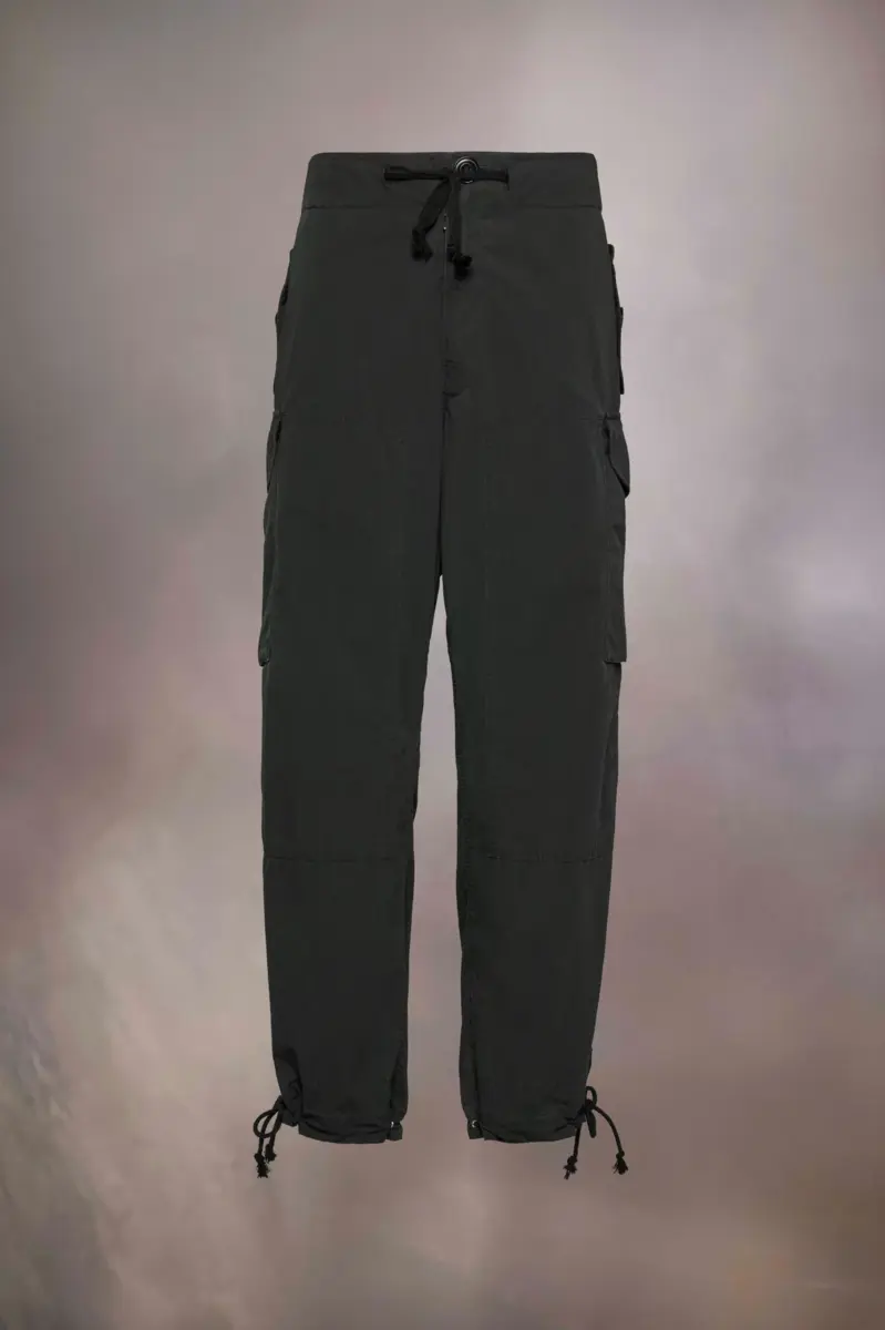 Los pantalones cargo están confeccionados en una mezcla de algodón y nailon y cuentan con amplios bolsillos laterales funcionales. Tienen cordones en los bajos y cintura ajustable para un ajuste versátil. Se cierran con un botón y el gancho de Margiela, con un cuadrado en blanco en la espalda para jugar con el anonimato. Las cuatro puntadas, la firma de Maison Margiela, aparecen en la espalda; lo opuesto a una etiqueta.