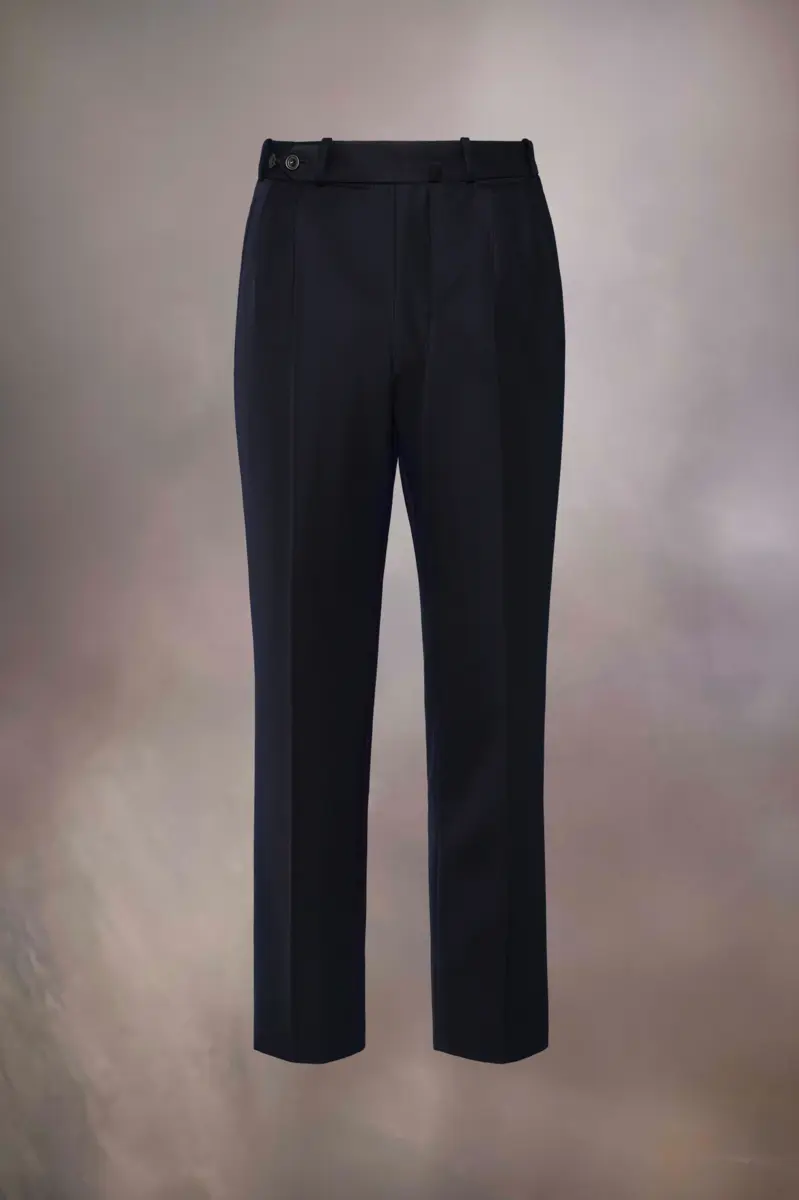 Los pantalones plisados están confeccionados en lana, con cintura alta y corte recto. Incorporan el gancho Margiela, trabillas, botones laterales, bolsillos y una solapa frontal. Las cuatro puntadas, insignia de Maison Margiela, aparecen en la espalda; el reverso de una etiqueta.