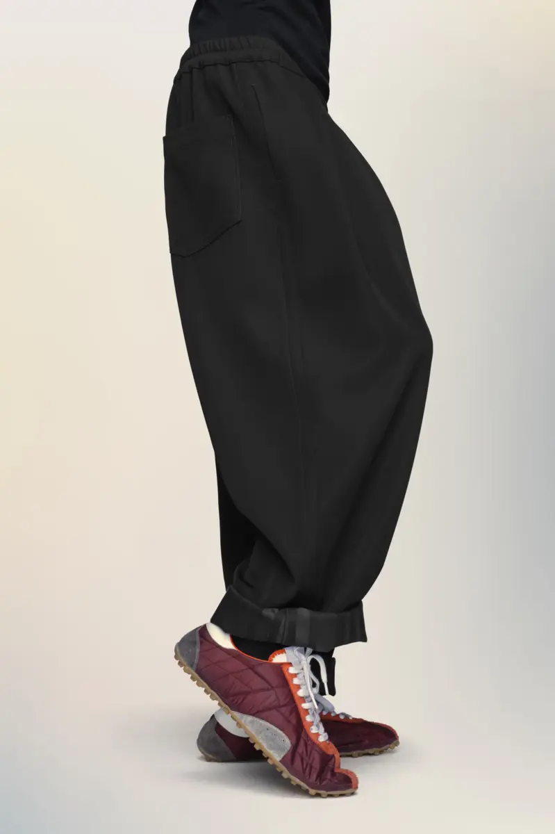 Combinando una estructura discreta con comodidad, estos pantalones presentan plisados delanteros y cintura elástica. Confeccionados en lana Barathea, su corte ligeramente cónico y su fluidez reflejan la reinterpretación de la Maison para el día a día. Los bajos se pueden enrollar para revelar la inconfundibilidad del forro, un detalle discreto que evoca la reinterpretación de los clásicos rurales de la colección. Las cuatro puntadas, el sello distintivo de Maison Margiela, aparecen en la espalda; lo opuesto a una etiqueta.