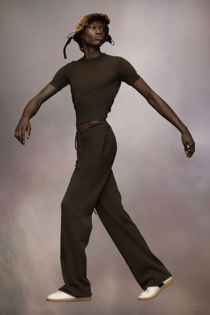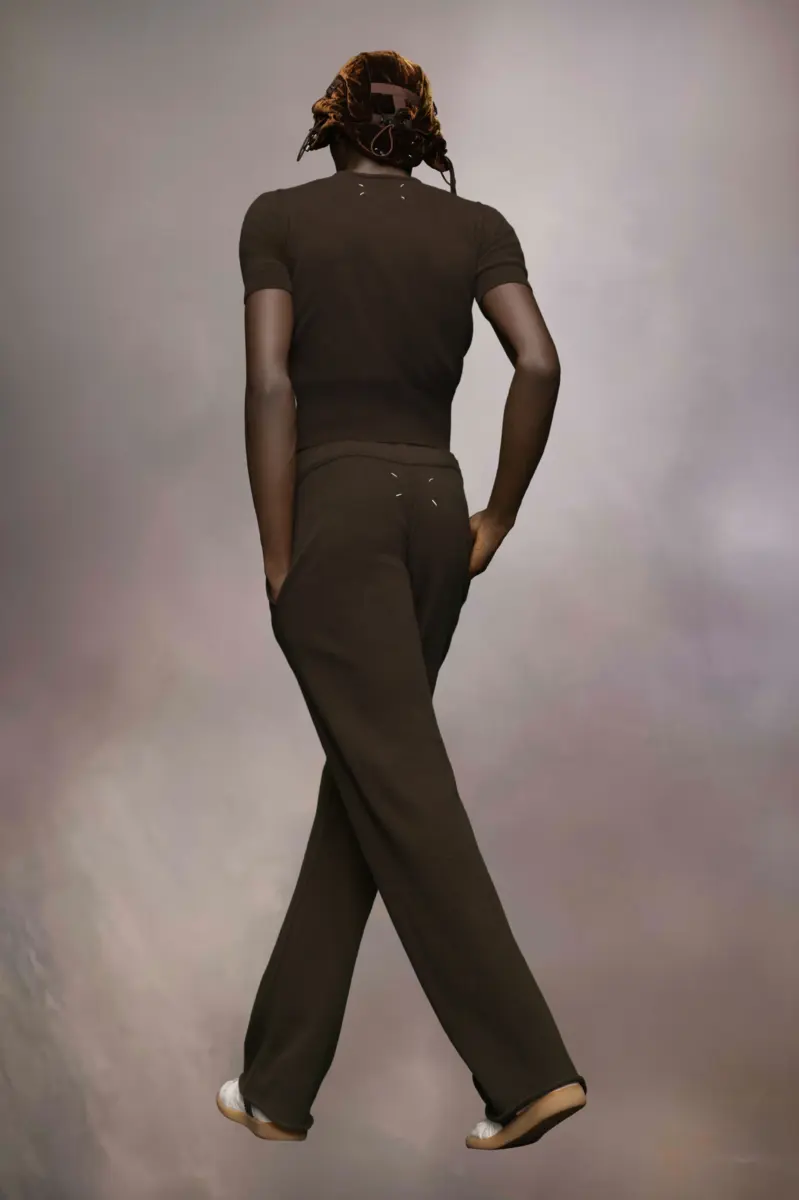 Los pantalones de chándal están confeccionados en una suave mezcla de lana y cachemira. Diseñados para estar en casa, presentan una cinturilla acanalada con cordón extralargo para un ajuste perfecto. Cuentan con bolsillos laterales y pernera recta, con un ligero fruncido en el bajo para un look relajado. Las cuatro puntadas, el sello distintivo de Maison Margiela, aparecen en la espalda; lo opuesto a una etiqueta.
