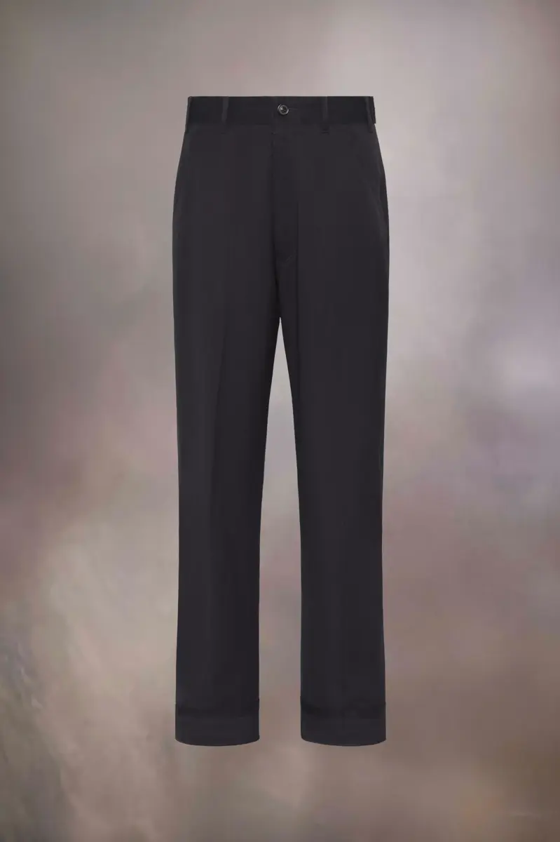 Estos pantalones clásicos están confeccionados en lana y lino, con bolsillos y cierre de gancho Margiela. Presentan pliegues, trabillas y una banda a tono alrededor del tobillo. Las cuatro puntadas, el sello distintivo de Maison Margiela, aparecen en la espalda; lo opuesto a una etiqueta.