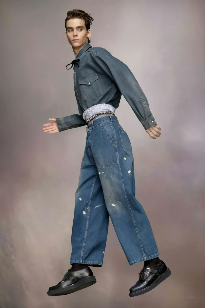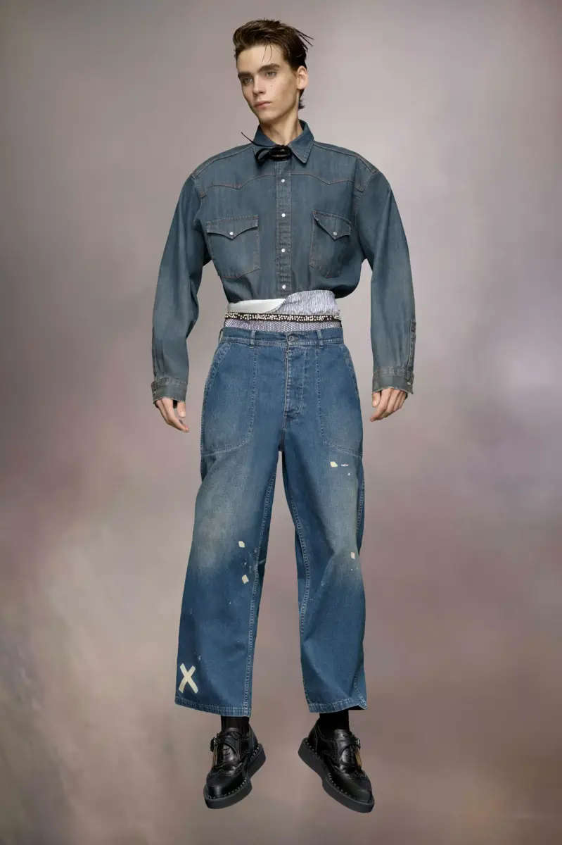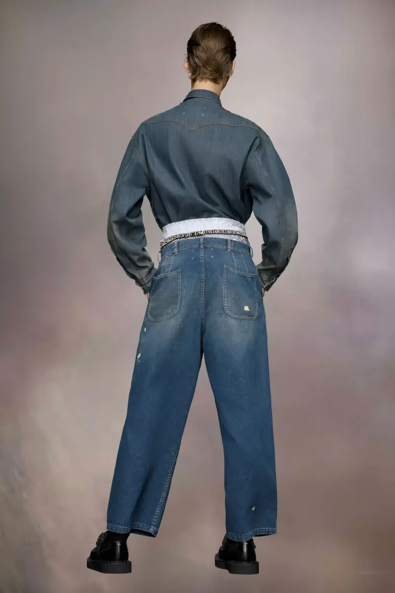 Los vaqueros de pierna recta con bolsillos delanteros largos presentan detalles desgastados que les dan un aire desenfadado, como una X estampada y salpicaduras de pintura. El distintivo logo de Maison Margiela, las cuatro puntadas, aparece en la espalda; lo opuesto a una etiqueta.