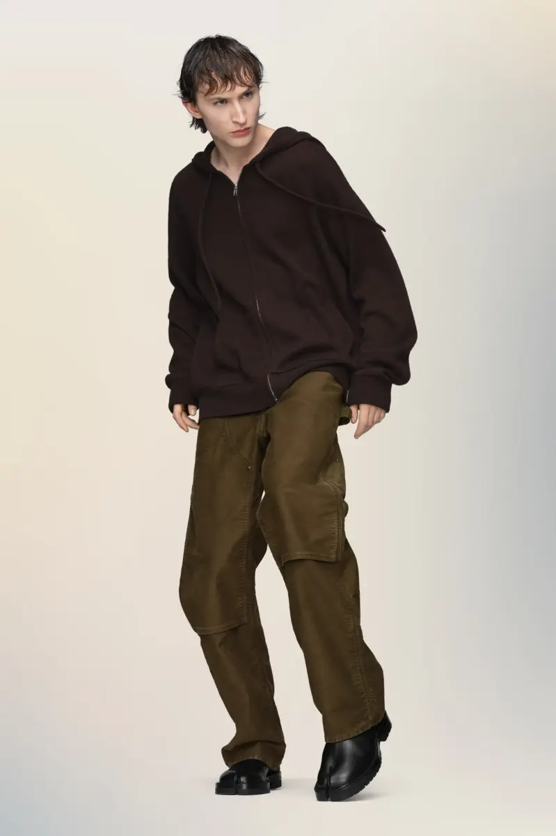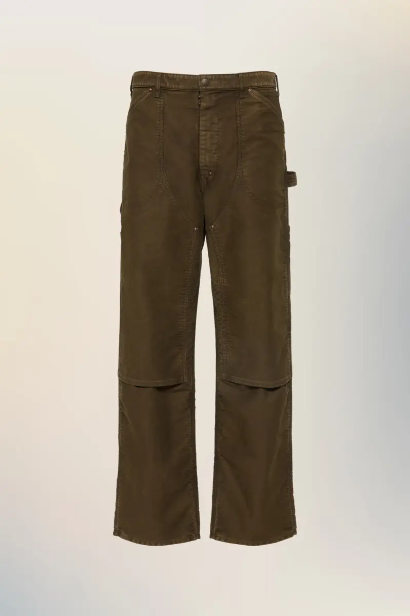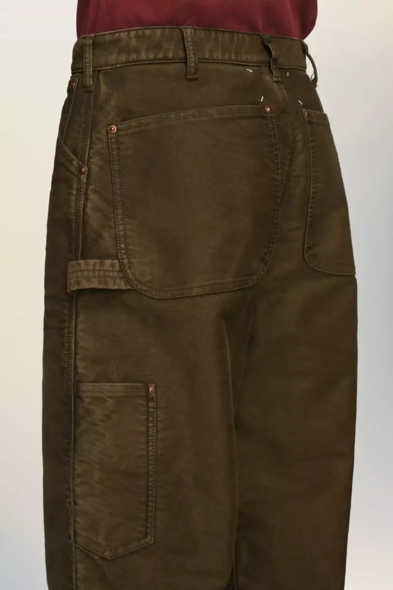 Confeccionados en piel de topo de trabajador, con pernera recta y paneles frontales curvos, estos pantalones transmiten una sensibilidad utilitaria con raíces artesanales. Una trabilla lateral para herramientas y refuerzos en las rodillas realzan su diseño funcional, en consonancia con la reinterpretación de los clásicos de la ropa de trabajo de la Maison. Las cuatro puntadas, el sello distintivo de Maison Margiela, aparecen en la espalda; lo opuesto a una etiqueta.