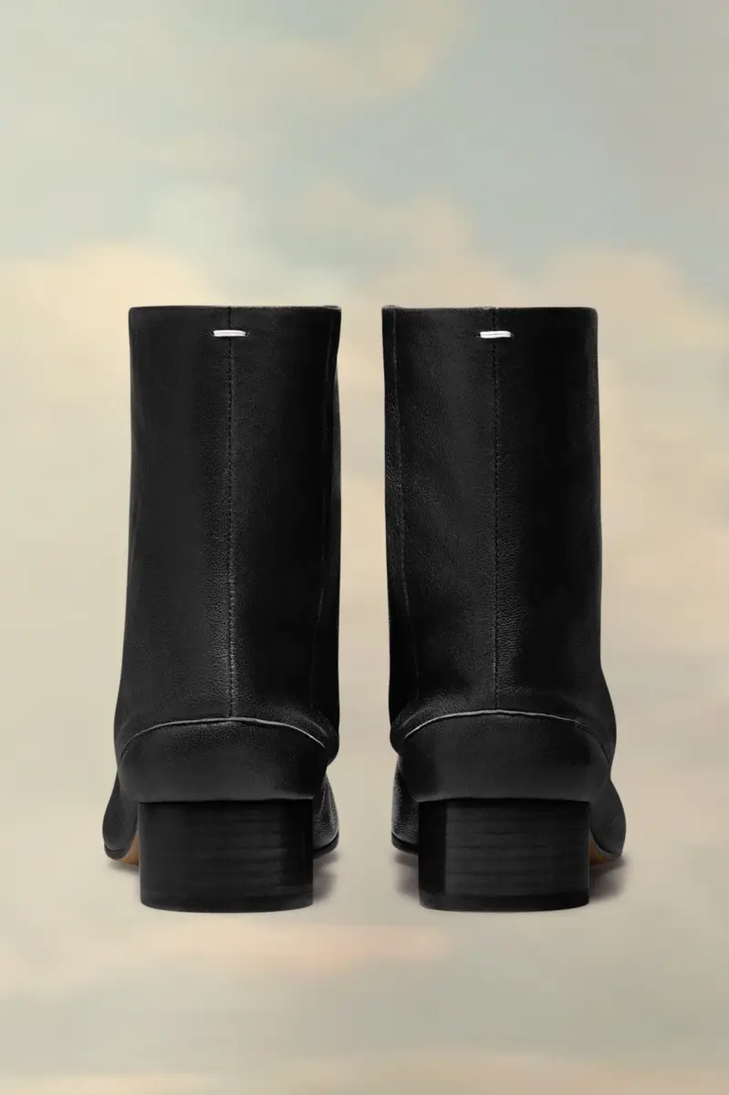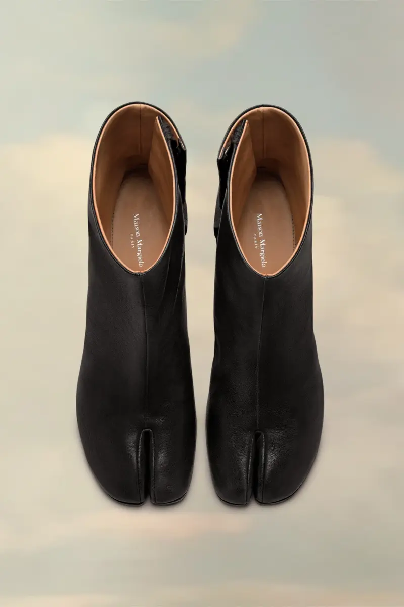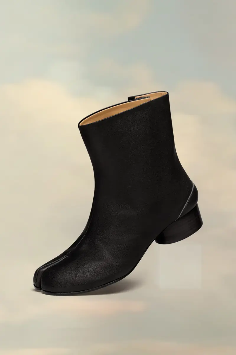 Elaborados en piel de camello, estos botines presentan un tacón cilíndrico de 3 cm y la forma Tabi de punta dividida, inspirada en el tradicional calcetín japonés del siglo XV que lleva el mismo nombre, lanzado para la colección de debut de la Maison en 1989. Captura el espíritu vanguardista e insubordinado de la Maison y existe como un clásico heredado, continuamente explorado a través de cada colección.