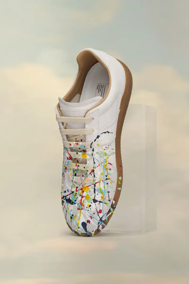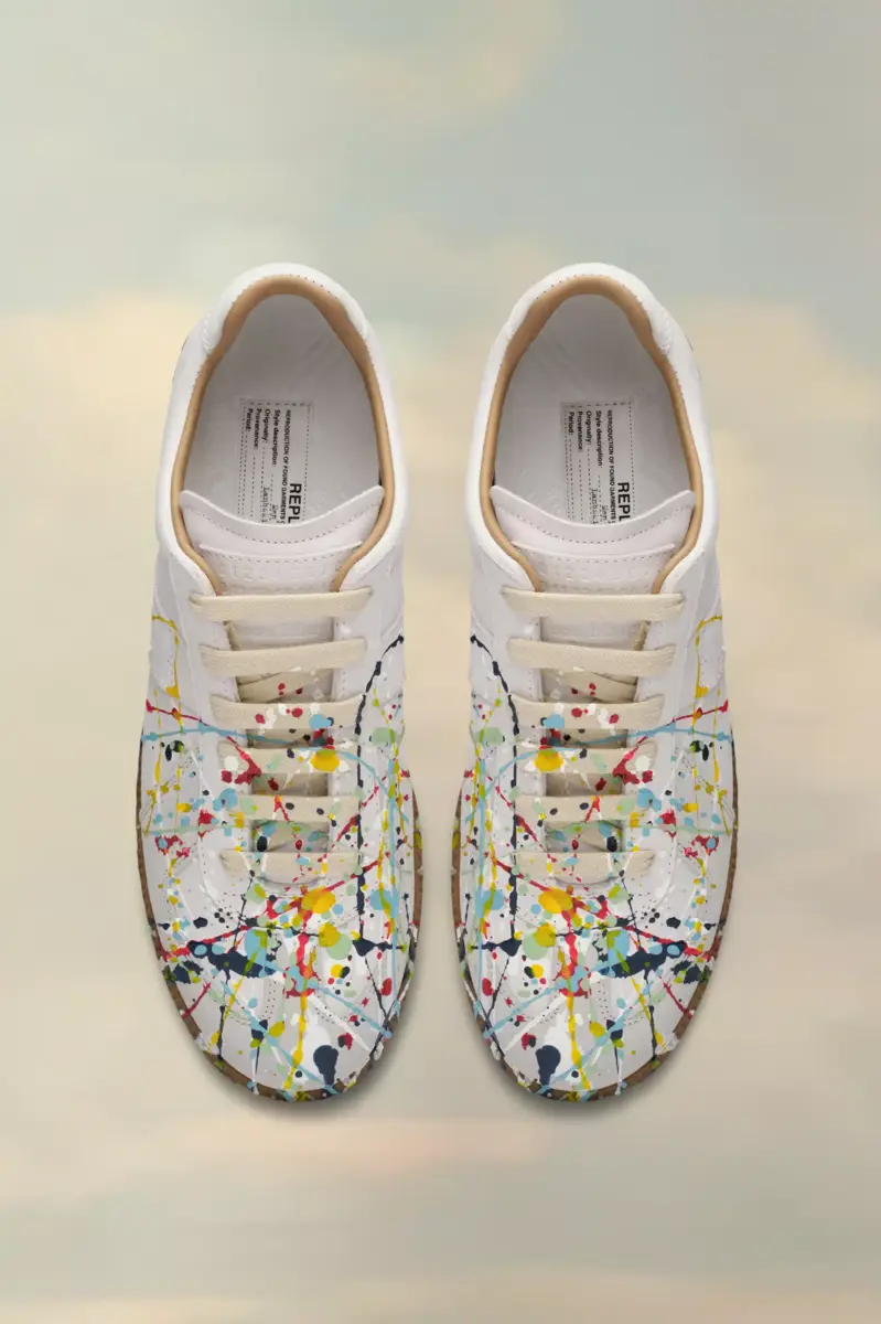 Las zapatillas Replica de piel nobuk y terciopelo presentan un diseño con salpicaduras de pintura. Las icónicas zapatillas Replica de la Maison se inspiran en el calzado deportivo austriaco de los años setenta. Los detalles de las Replica se renuevan continuamente según las inspiraciones de la temporada.