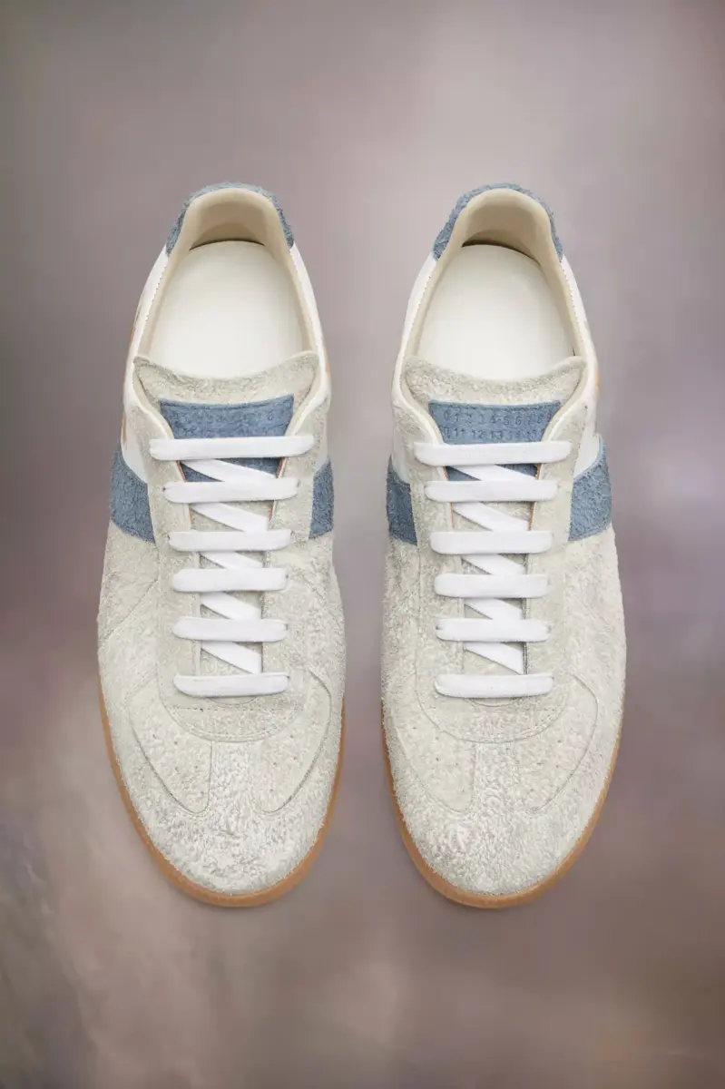 Las zapatillas Replica, de piel con tratamiento vintage y ante peludo, presentan una clásica suela de goma. El icónico modelo Replica de la Maison se inspira en el calzado deportivo austriaco de los años setenta. Los detalles de las Replica se renuevan constantemente según las inspiraciones de la temporada. La característica puntada blanca de Maison Margiela aparece en la parte trasera.