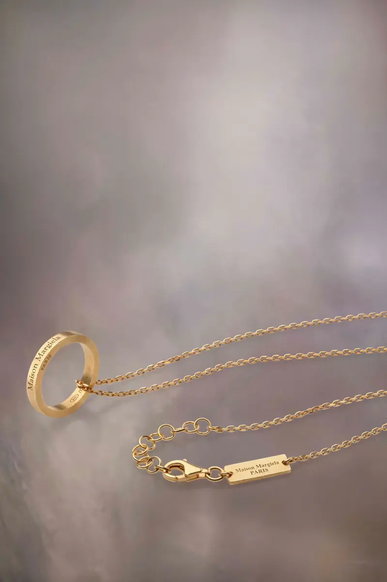 El anillo con baño de oro amarillo, con el logotipo de Maison Margiela grabado, cuelga como un colgante de una fina cadena. Composición: 100 % plata. Palladio burattato. Collar con anillo y logotipo en plata de ley. Evitar el contacto con agua salada, clorada y líquidos agresivos. Fabricado en Italia. Ancho: 3 mm. Largo del collar: 60 cm (23 pulgadas) + 3 cm (1,1 pulgadas) de ajuste.