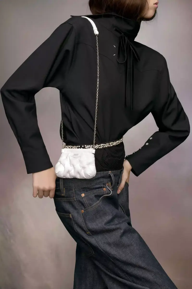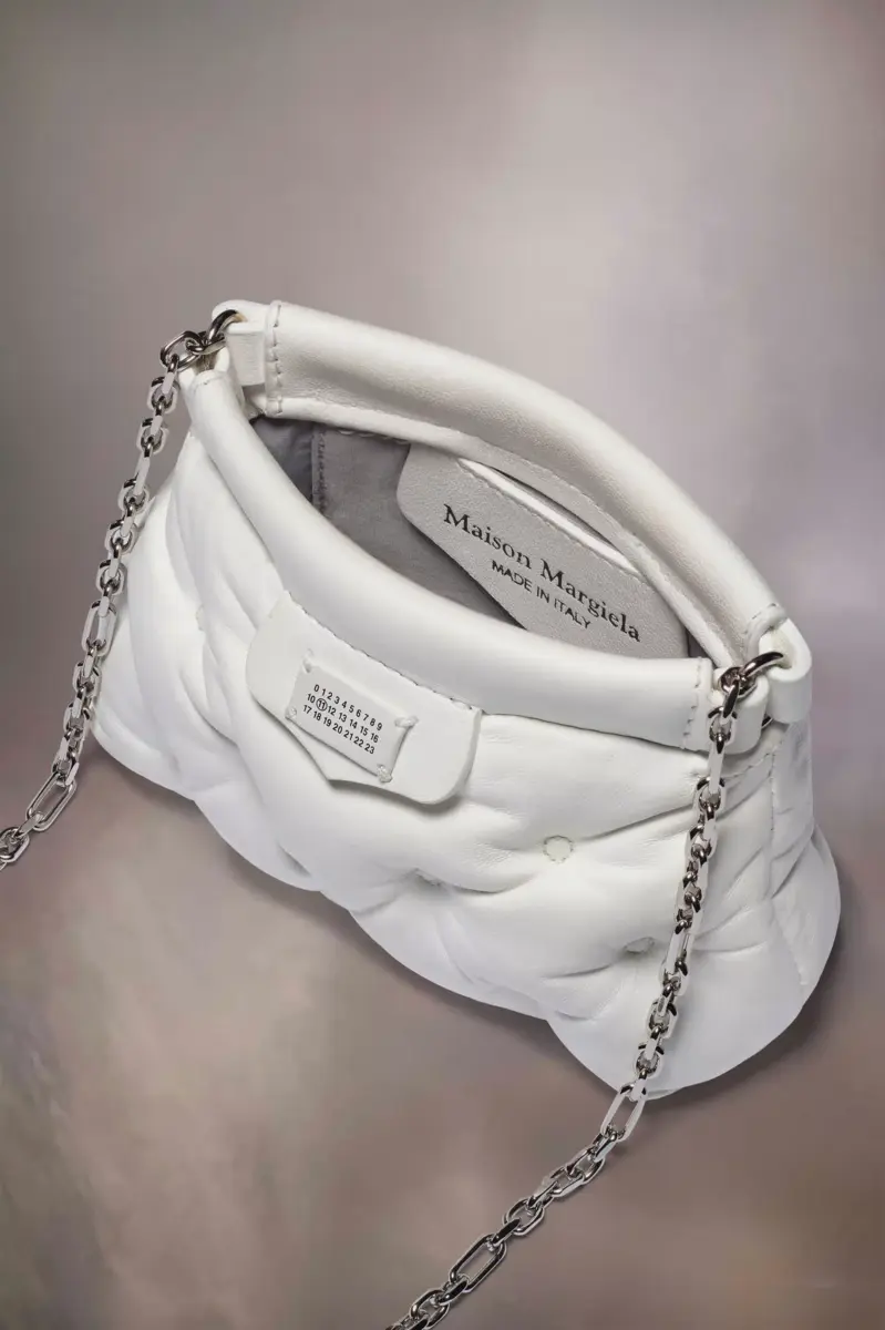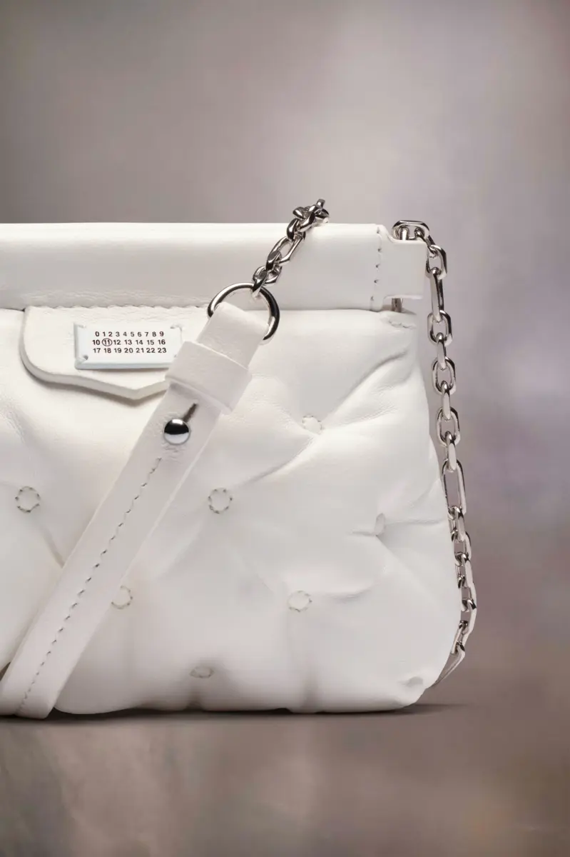 El Glam Slam classique para bebé está confeccionado en napa con un bordado especial. El Glam Slam debutó en el desfile Primavera/Verano 2018 y presenta un diseño acolchado que imita el matelassé, el estilo de las colchas cosidas a mano creadas en Marsella, Francia. El concepto refleja la noción de glamour inconsciente de la Maison y evoca su asociación con la comodidad, siguiendo el estudio de los rituales de vestimenta y viajes por todo el mundo. Este estilo cuenta con una correa de cadena para múltiples usos y está adornado con la etiqueta del logotipo numérico en la parte delantera.