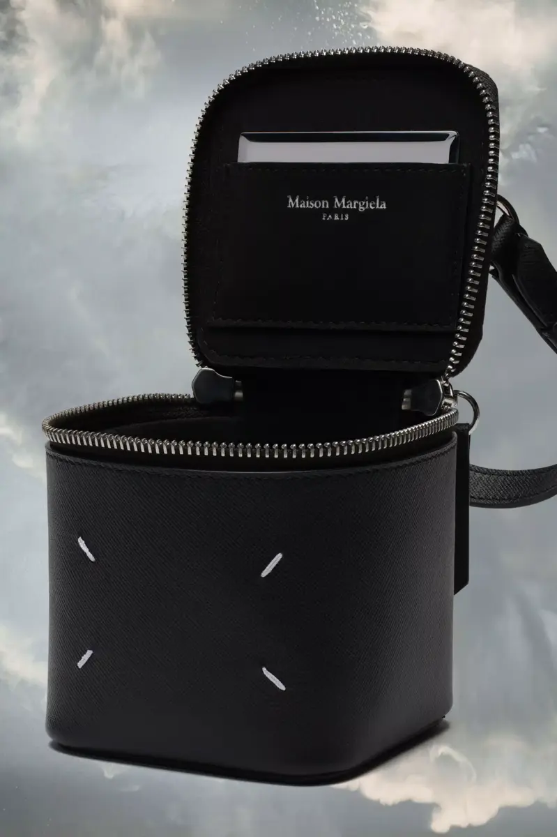 Con un asa superior ajustable, el mini bolso en forma de caja viene en piel de becerro con detalles de herrajes metálicos. Las cuatro puntadas distintivas de Maison Margiela aparecen en la parte delantera; lo opuesto a una etiqueta.