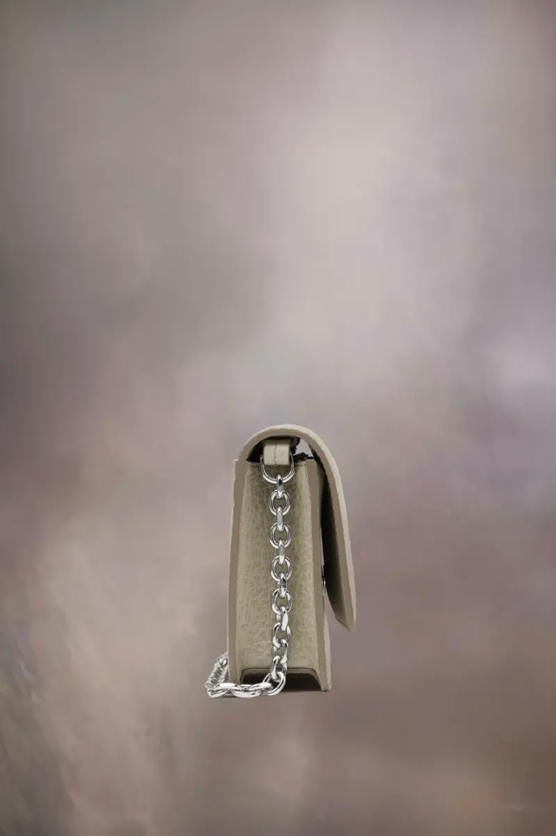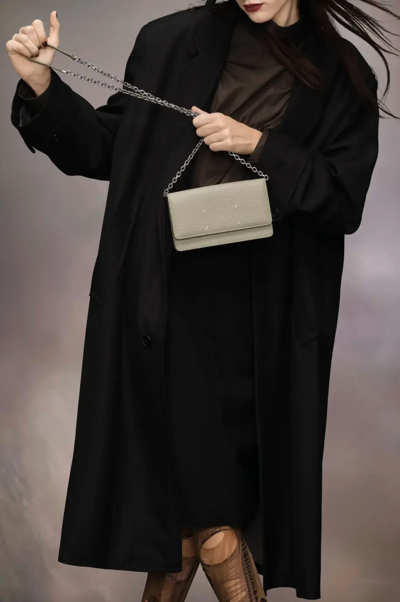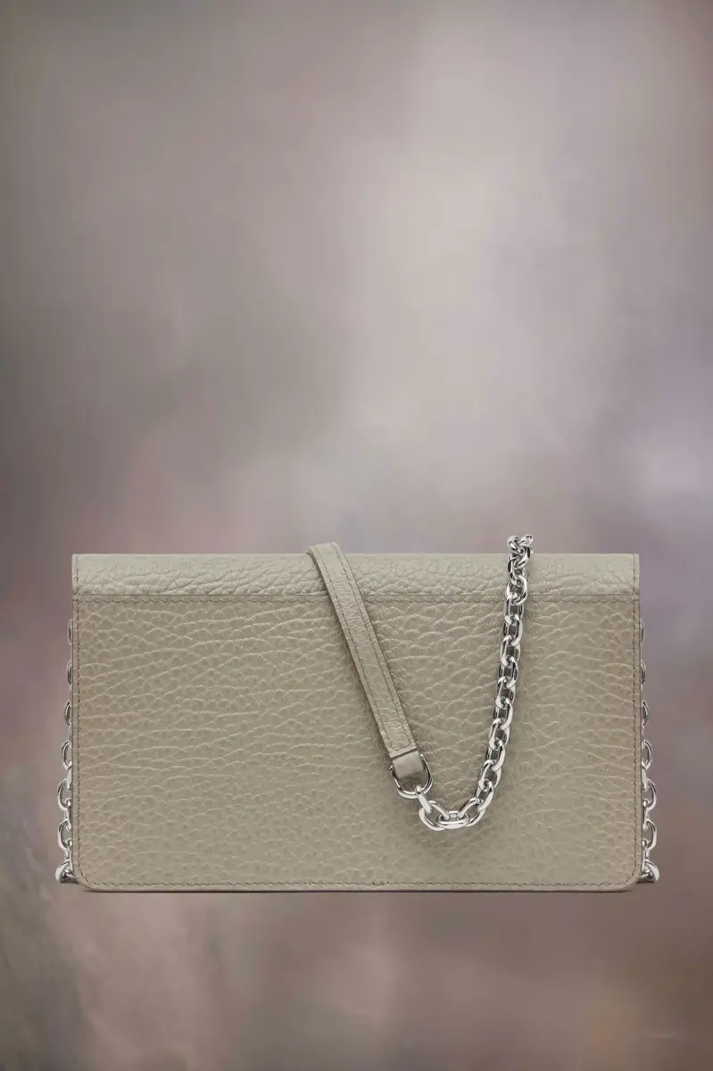En piel granulada repujada con cadena, esta cartera cuenta con cierre de botón a presión y cremallera interior. Luce el logotipo numérico en el interior. La firma de Maison Margiela, las cuatro puntadas, aparece en la solapa; en el reverso de una etiqueta.