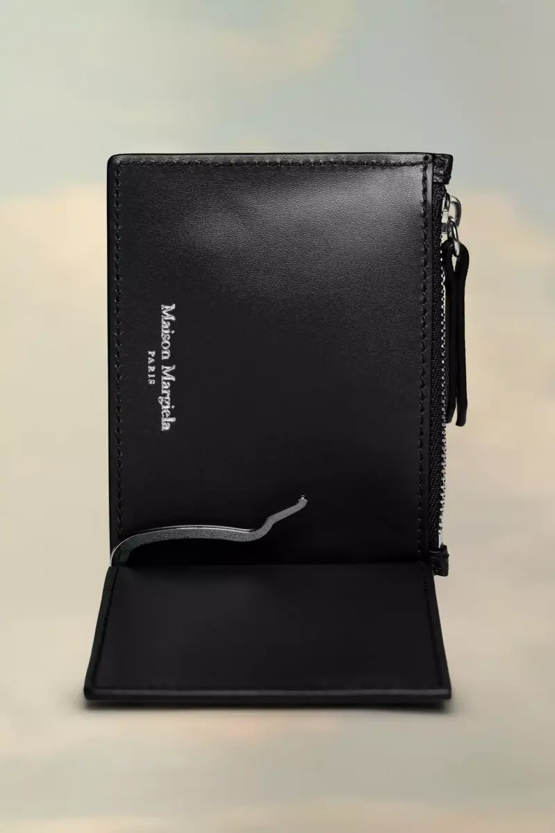 En piel granulada, la cartera cuenta con un clip para billetes y un compartimento para monedas con cremallera. El logotipo aparece en el interior. La firma de Maison Margiela, las cuatro puntadas, aparece en la parte trasera; en el reverso de una etiqueta.
