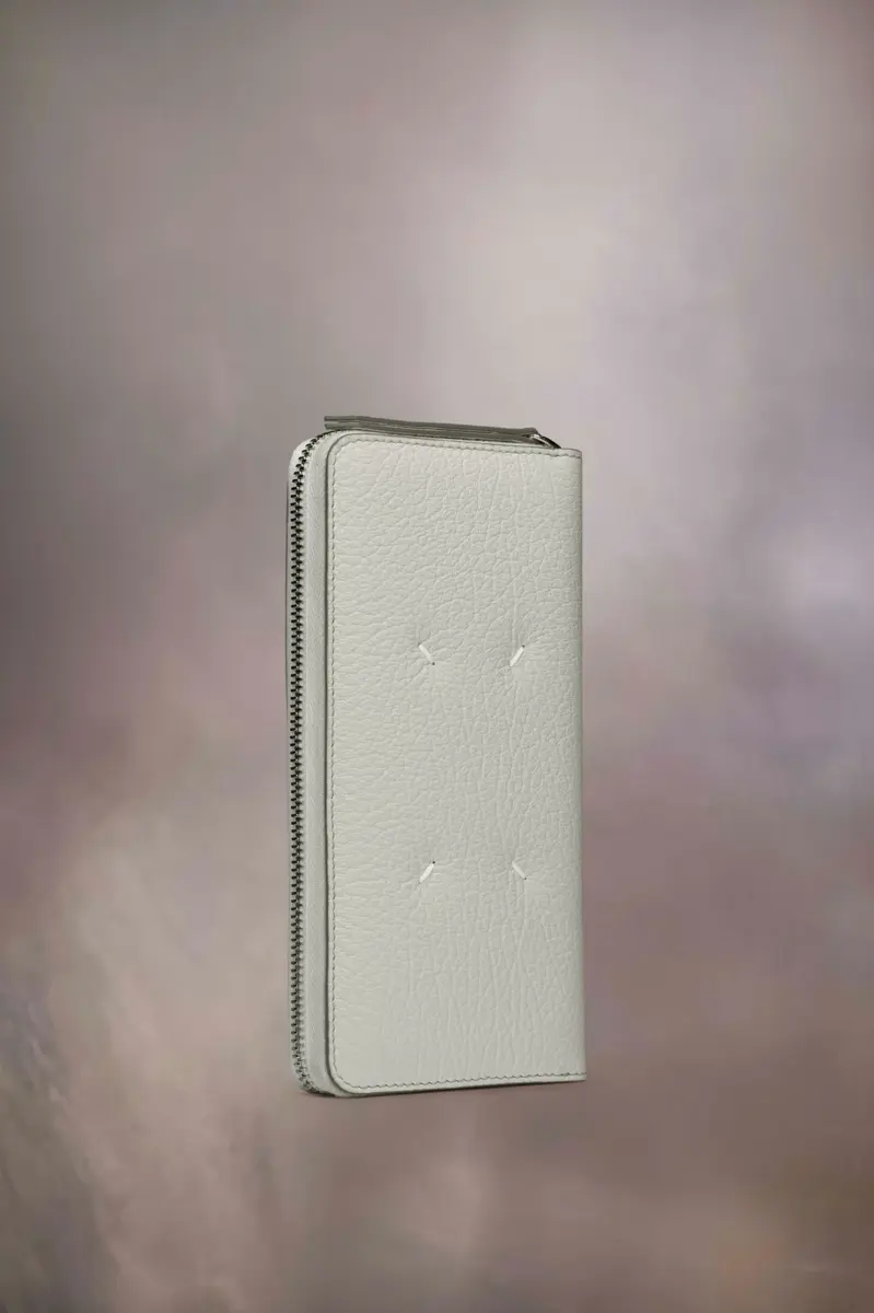 Confeccionada en piel granulada repujada, esta cartera con cremallera perimetral cuenta con un monedero interior con cremallera y tarjeteros, con el logotipo numérico interior. Las cuatro puntadas, la firma de Maison Margiela, aparecen en la parte trasera; el reverso de una etiqueta.