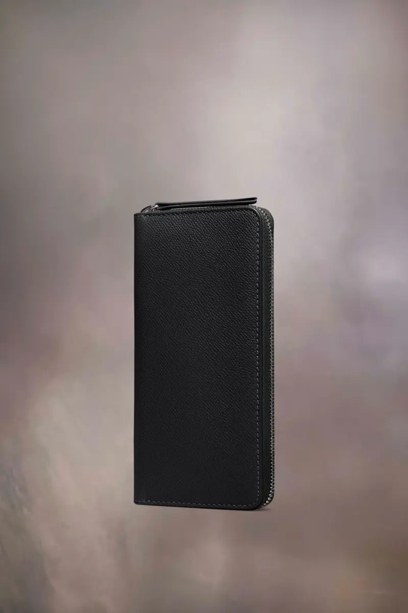 Elaborada en piel granulada, esta cartera con cremallera envolvente incluye un monedero interior con cremallera y tarjeteros, con el logotipo interior. Las cuatro puntadas distintivas de Maison Margiela aparecen en la parte trasera; el reverso de una etiqueta.
