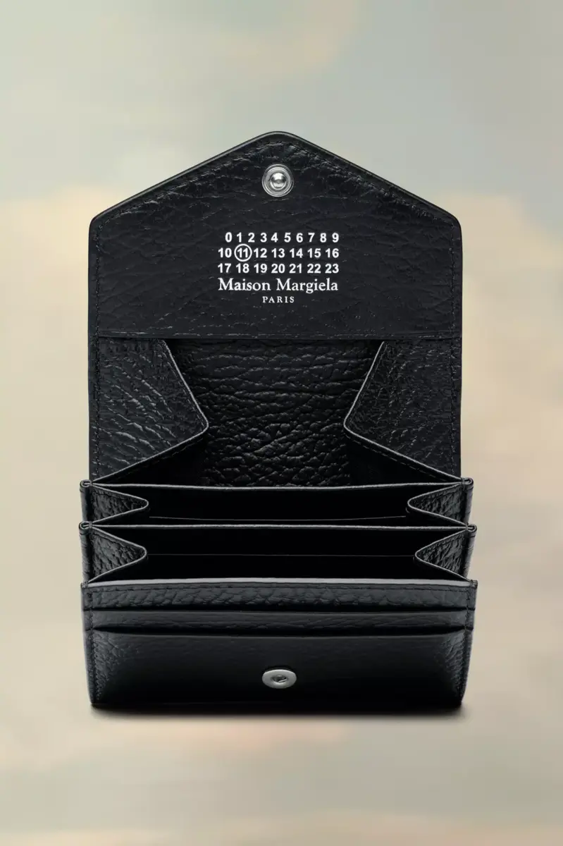 Cartera tipo sobre con interior tipo acordeón, compartimentos abiertos y ranuras para tarjetas. El logotipo de Maison Margiela aparece en el interior y las cuatro puntadas en contraste adornan la parte trasera. Fabricada en Italia. Exterior: Piel de becerro granulada de tacto suave. Interior: Piel de becerro. Forro: Viscosa. Cuatro puntadas en la parte delantera. Cierre con botón a presión. Logotipo estampado en el interior. Bolsillos interiores planos. Dos ranuras para tarjetas. Limpiar con un limpiador específico para piel y un paño de microfibra húmedo. Fabricada en Italia. Medidas: 10 cm x 8 cm (largo x alto).