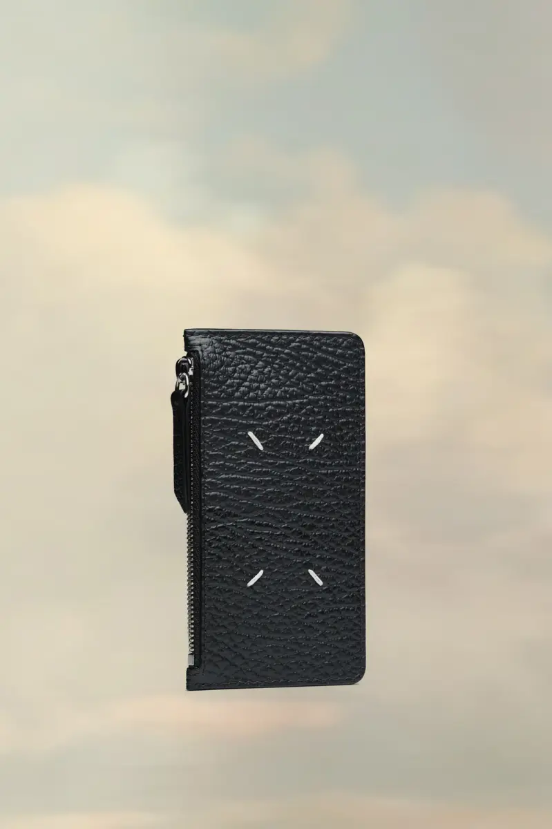 Elaborada en piel granulada repujada, esta cartera portatarjetas cuenta con un compartimento con cremallera para monedas y cinco tarjeteros. El logotipo numérico aparece en el interior. La firma de Maison Margiela, las cuatro puntadas, aparece en la parte trasera; el reverso de una etiqueta.