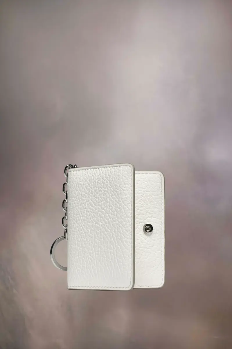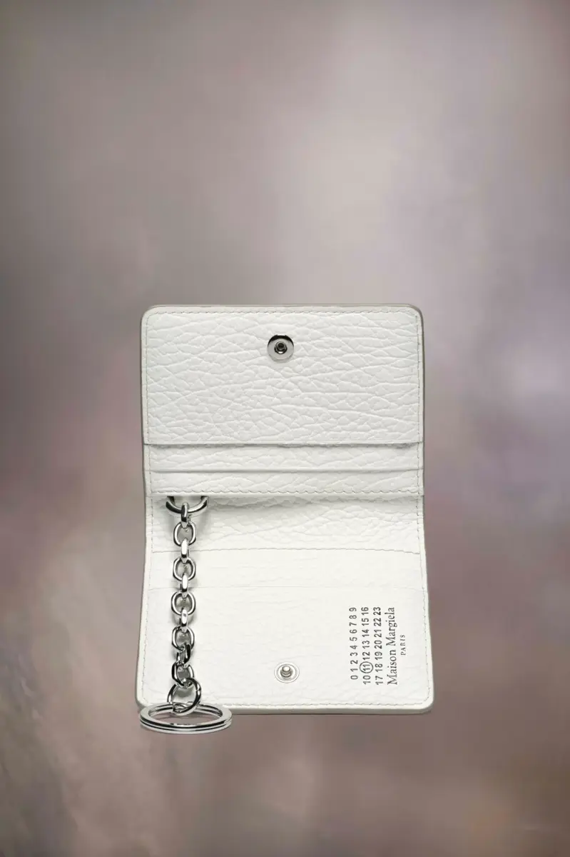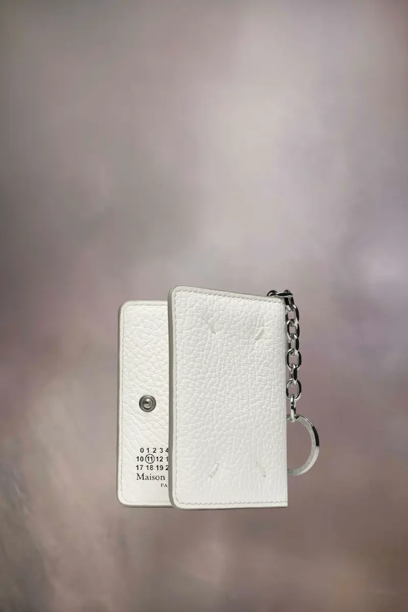 Elaborado en piel granulada repujada, este tarjetero cuenta con una cadena para llavero, cierre de botón a presión y múltiples compartimentos para tarjetas. Las cuatro puntadas distintivas de Maison Margiela aparecen en la parte trasera; el reverso de una etiqueta.