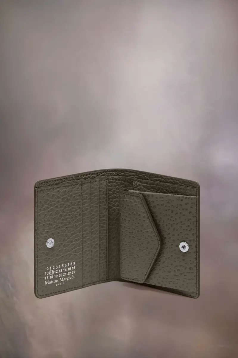 Elaborado en piel granulada repujada, este tarjetero cuenta con un bolsillo interior tipo sobre y un logotipo numérico con cuatro ranuras para tarjetas. La firma de Maison Margiela, las cuatro puntadas, aparece en la parte trasera; el reverso de una etiqueta.
