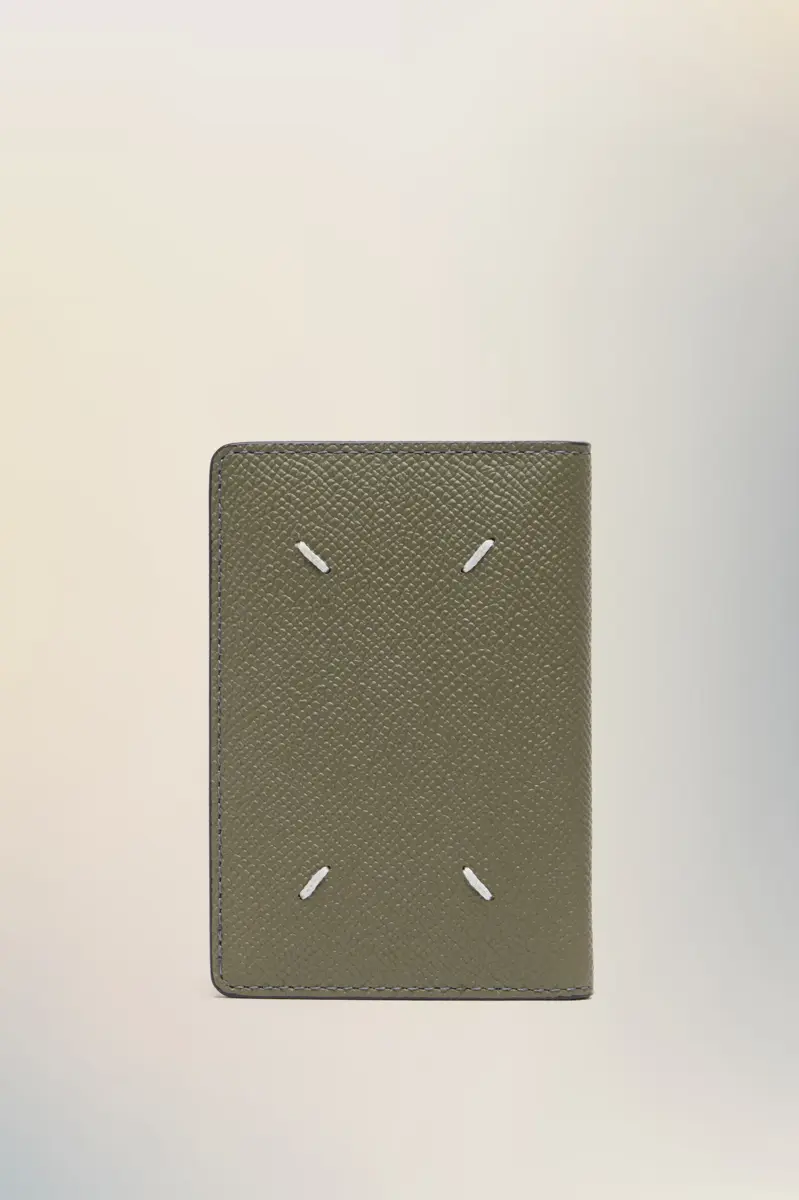 El tarjetero cuenta con cuatro ranuras para tarjetas y compartimentos para billetes. Está confeccionado en piel granulada con el logotipo en el interior. La firma de Maison Margiela, las cuatro puntadas, aparece en la parte trasera; en el reverso de una etiqueta.