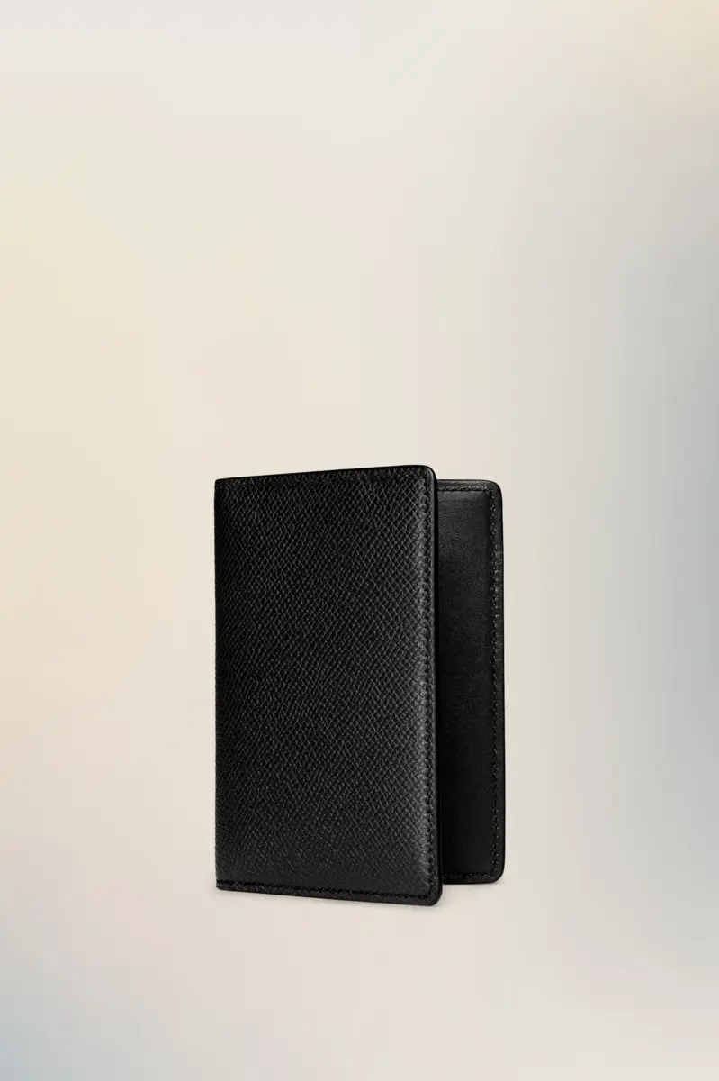 El tarjetero cuenta con cuatro ranuras para tarjetas y compartimentos para billetes. Está confeccionado en piel granulada con el logotipo en el interior. La firma de Maison Margiela, las cuatro puntadas, aparece en la parte trasera; en el reverso de una etiqueta.