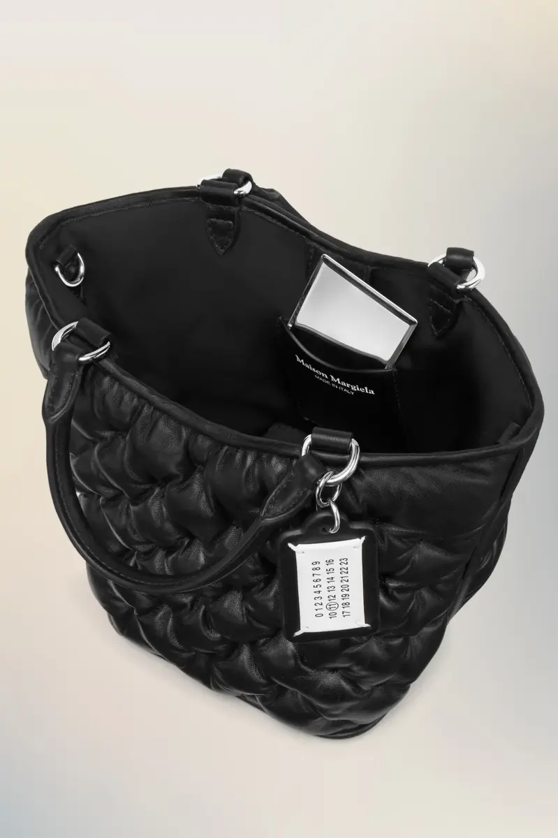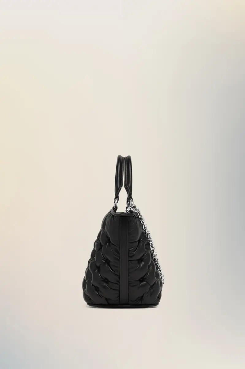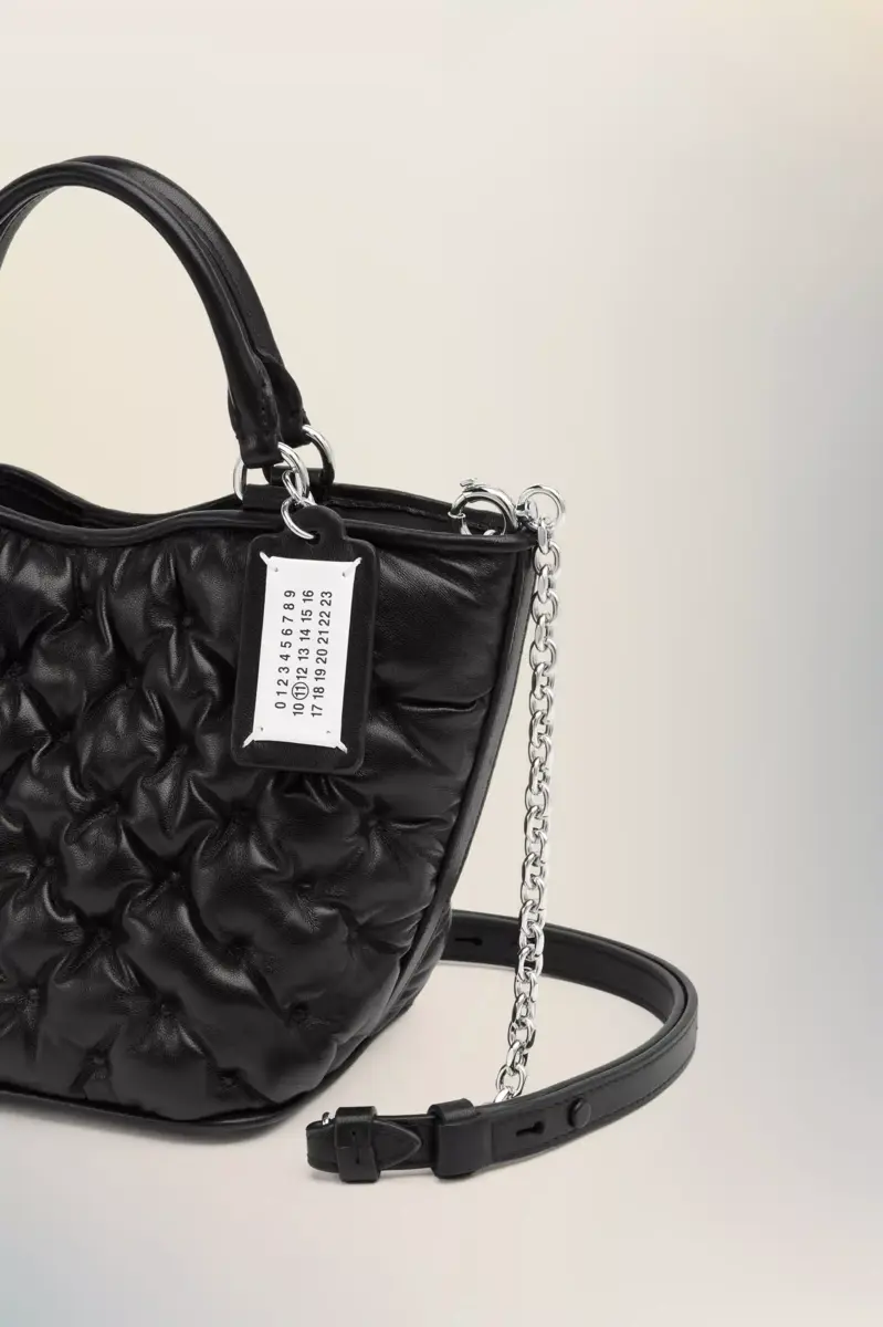 El mini bolso tote bordado Glam Slam está confeccionado con un cuerpo acolchado y una correa de cadena plateada. Su distintiva textura imita el tradicional acolchado matelassé de Marsella, una referencia clave de la línea, que debutó en la colección Primavera/Verano 2018. Reflejando la idea del glamour inconsciente, el Glam Slam equilibra suavidad y estructura con una naturalidad instintiva. Acabado con la etiqueta con el logotipo numérico de la Maison y un espejo de bolsillo oculto para una elegancia en movimiento.