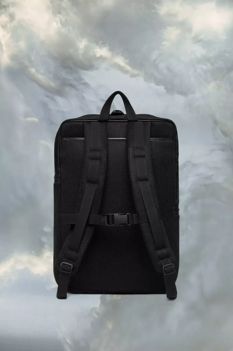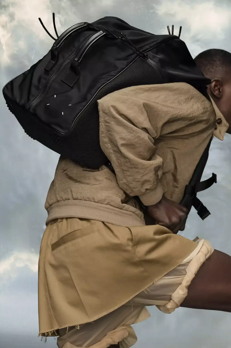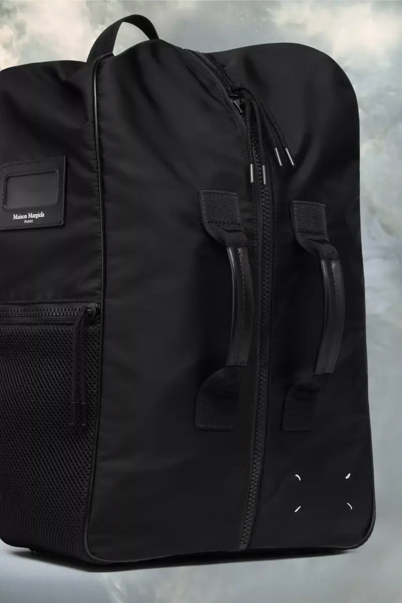 La mochila está hecha de nailon y cuenta con correas de hombro ajustables, asa superior y asas laterales para un uso versátil. Su diseño funcional incluye bolsillos y un cierre de cremallera que divide el centro con paneles de malla anatómicos. La hebilla luce el logotipo numérico de Maison Margiela y una ranura transparente en el lateral con el logotipo. Las cuatro puntadas distintivas de Maison Margiela aparecen en la esquina inferior. lo opuesto a una etiqueta.
