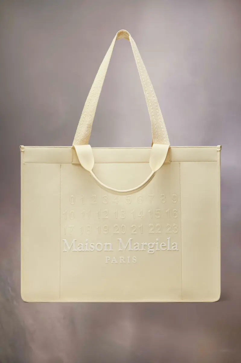 En piel de becerro con efecto toile (parte del estudio de la Maison para realzar la humilde tela), el gran bolso de compras Cabas se completa con asas superiores largas y cortas, además de bolsillos interiores. Está adornado con el logotipo numérico de Maison Margiela en la parte delantera, con los números en un acabado transparente para permitir el contraste del logotipo.