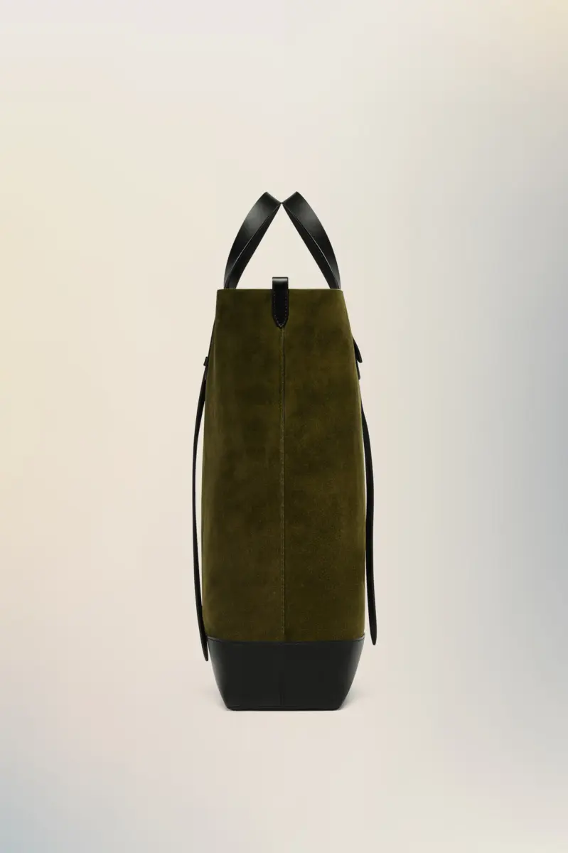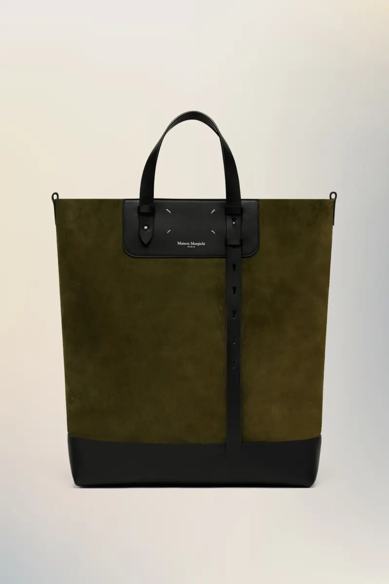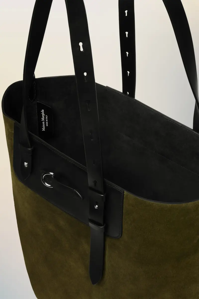 Este bolso tote explora la tensión entre estructura y suavidad, combinando un cuerpo flexible con correas de cuero inspiradas en la talabartería. Las asas superiores con cinturón se ajustan en longitud, mientras que el detalle de anilla en D y el forro de ante crudo insinúan un diseño ecuestre. El sello distintivo de la Maison, las cuatro puntadas, aparece en la parte trasera; lo opuesto a una etiqueta.