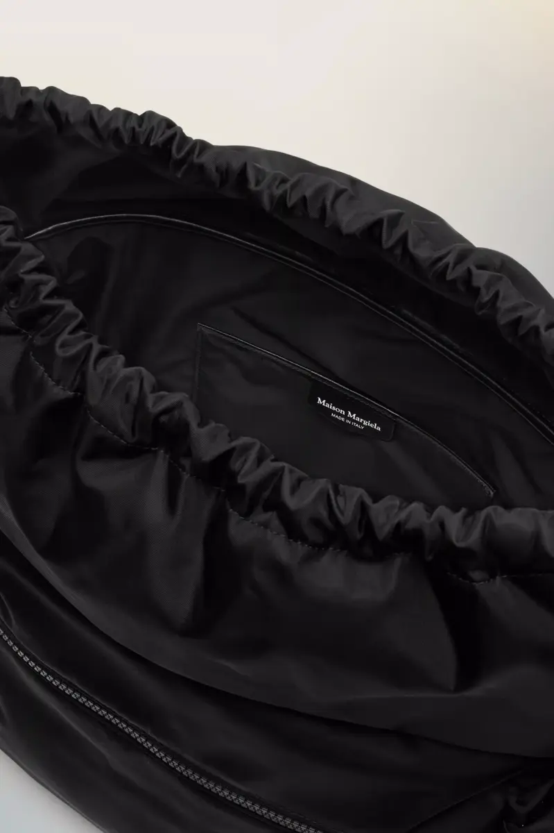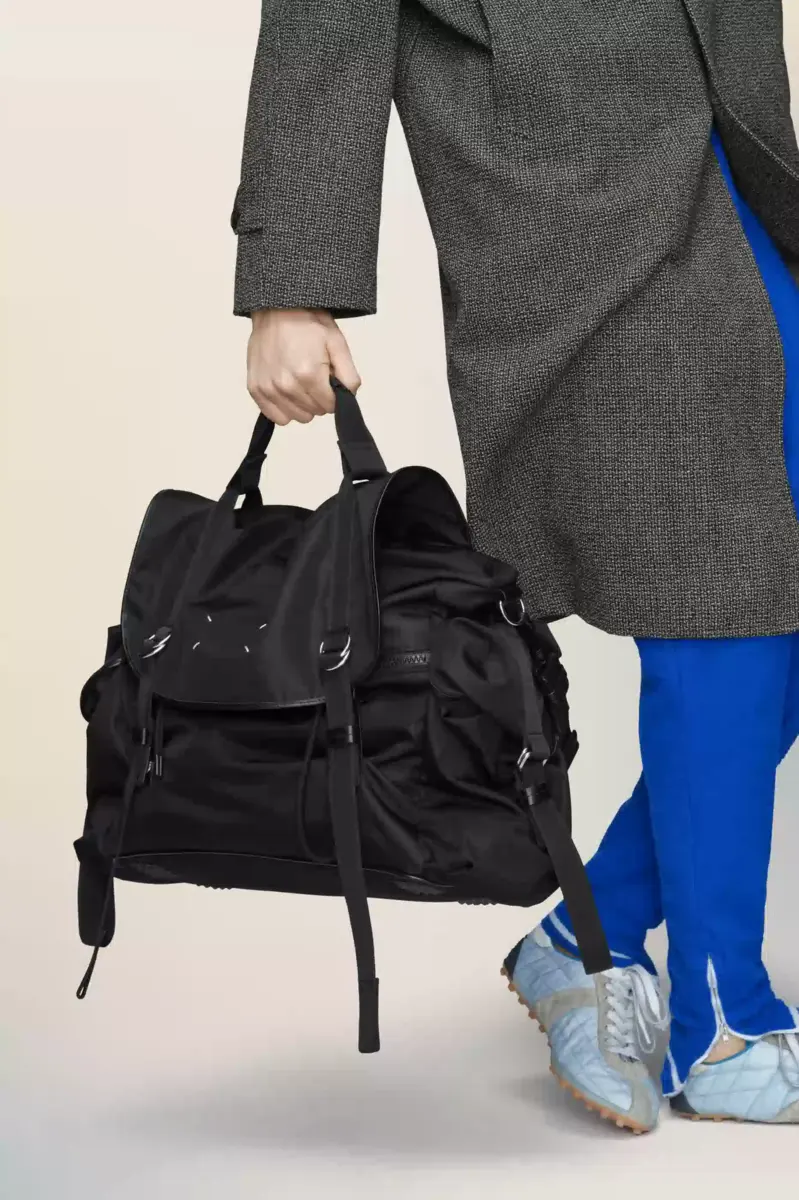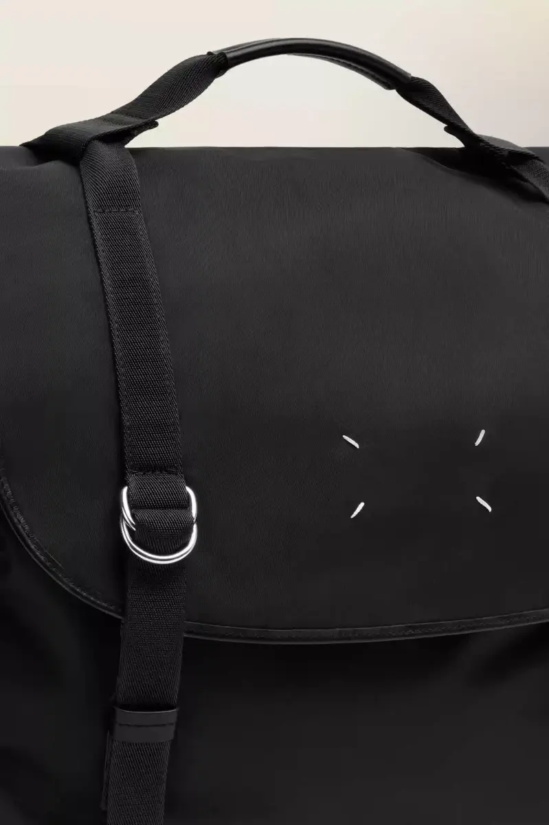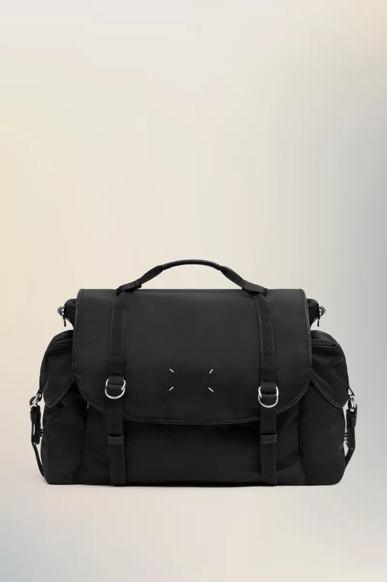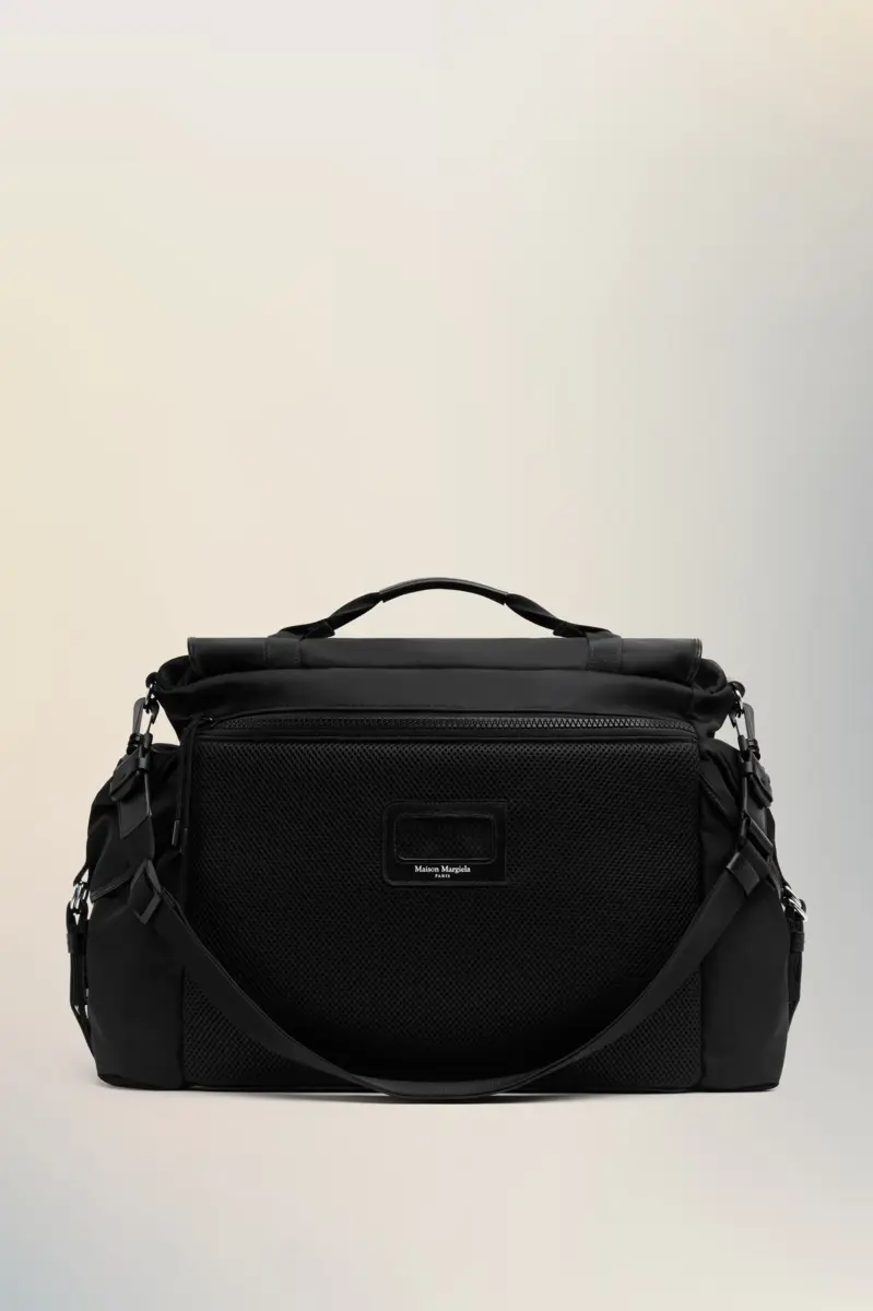 Maison Margiela reinventa el bolso bandolera con una forma esculpida, solapa superior con cierre de hebilla y dos compartimentos laterales. Su estructura rígida contrasta con la malla transpirable y las correas suaves, diseñadas para facilitar su uso. Una placa con el logotipo tonal se encuentra en la parte posterior, mientras que las cuatro puntadas aparecen en la parte delantera, lo opuesto a una etiqueta.