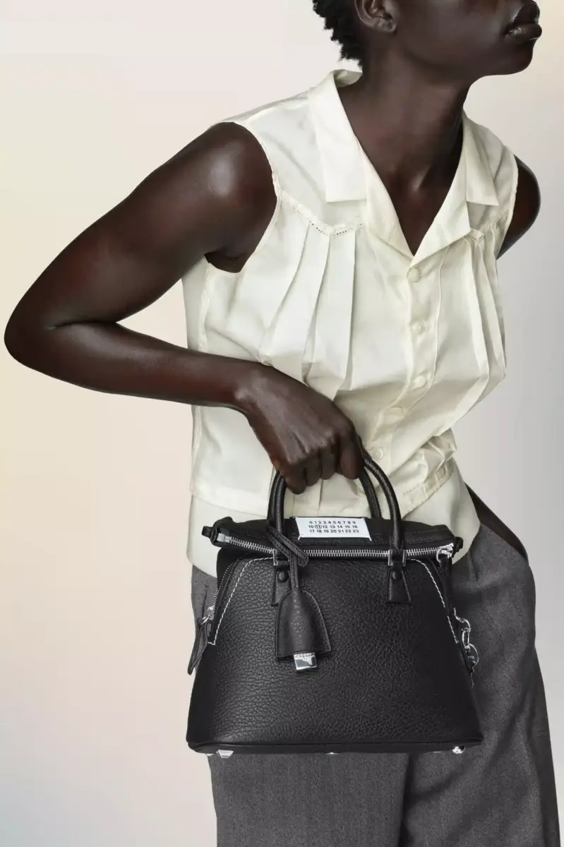 El 5AC classique mini, confeccionado en piel granulada, cuenta con asas superiores y una correa de hombro a tono. Luce la etiqueta con el logotipo en la parte delantera. La icónica línea 5AC toma su nombre de la palabra francesa «sac» (bolso). Explora el concepto de anonimato del forro de la Maison. Los remaches metálicos del bolso están recubiertos de piel a mano, con el metal visible solo donde es necesario, para una apariencia impecable. Los detalles artesanales incluyen los bordes expuestos del bolso pintados a mano a tono con el cuero.