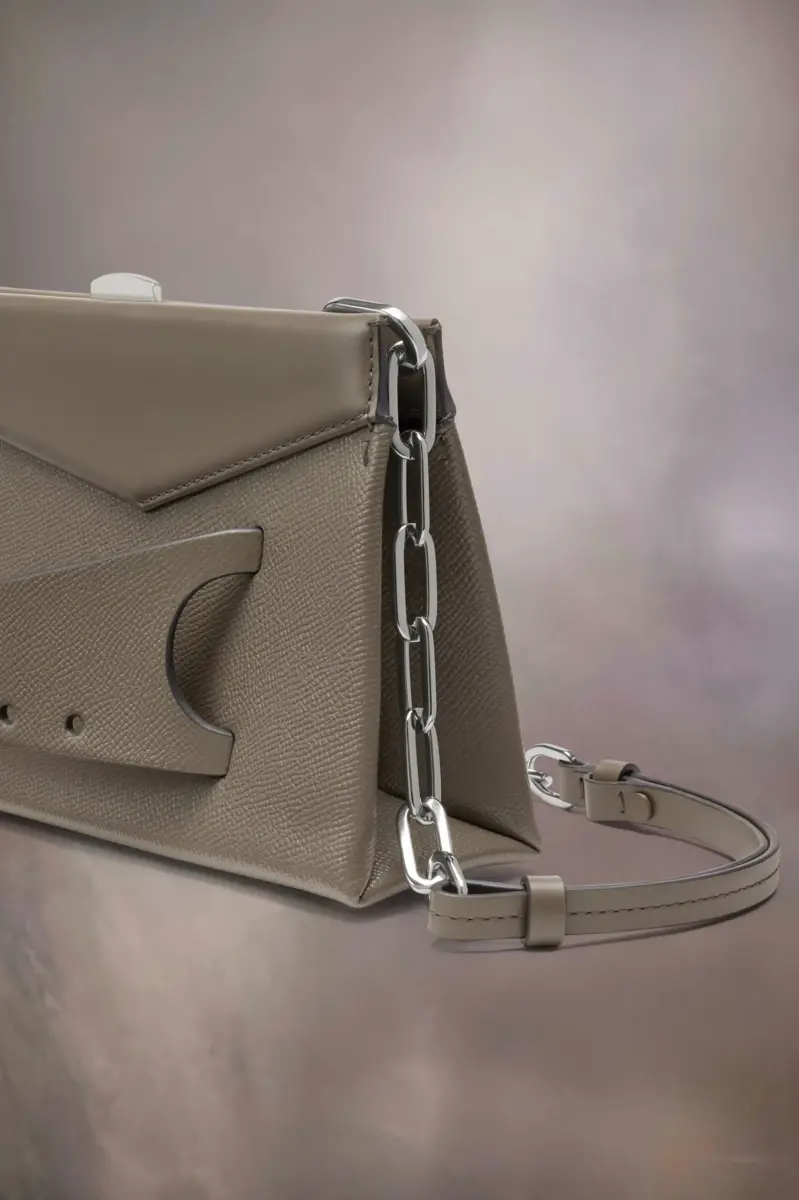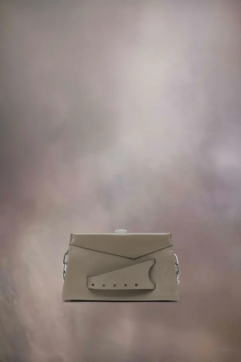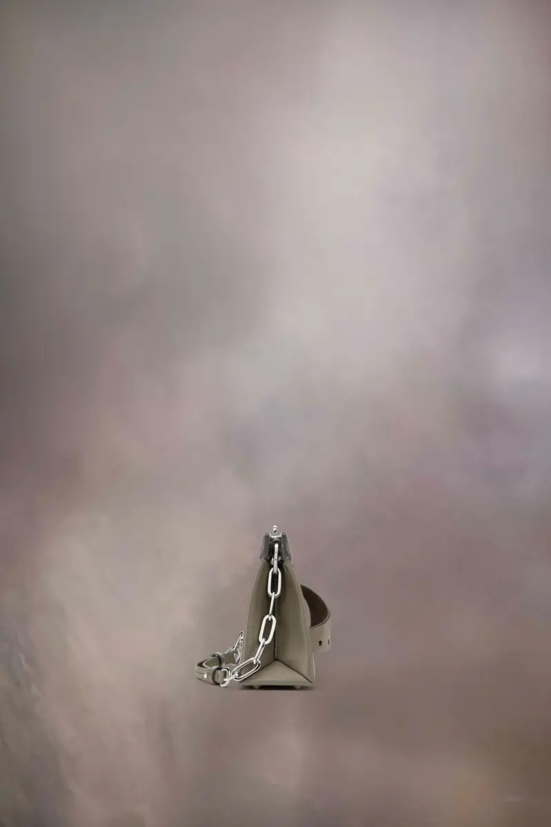 El pequeño bolso de hombro Snatched está elaborado en piel granulada. El Snatched debutó en la Colección Artesanal Otoño/Invierno 2019. Su nombre se debe al término coloquial que significa «buena apariencia» y también a su forma de llevarlo con estilo. Este bolso, sin género, presenta una forma asimétrica inspirada en el origami. Cuenta con una correa de cadena y un asa frontal perforada para usarse como un clutch.