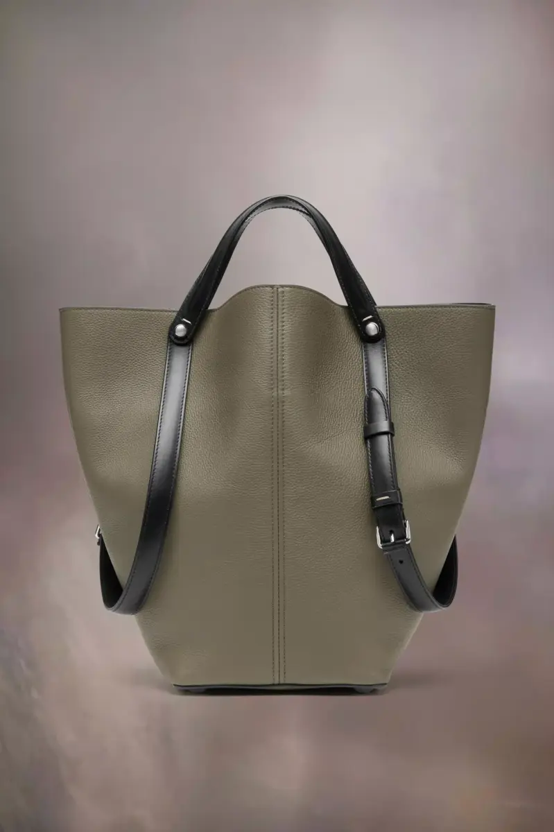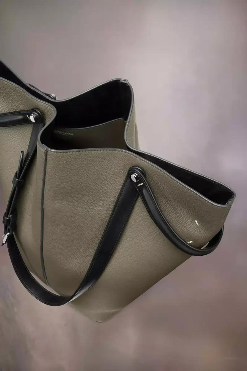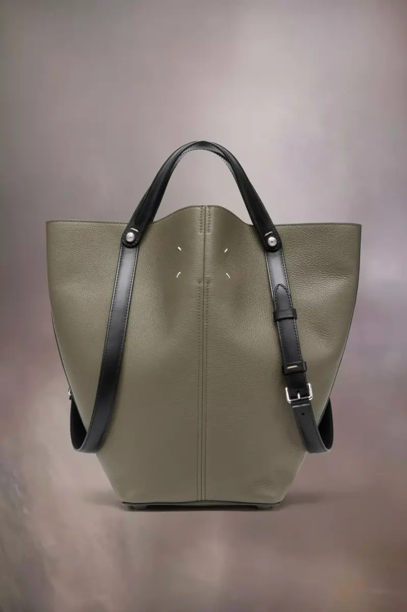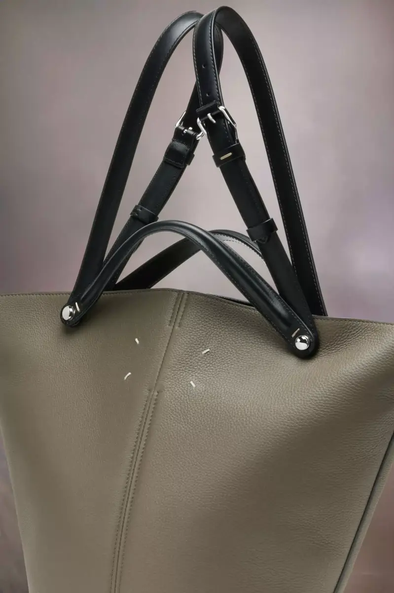 La Maison lanza el bolso Dress-age para la temporada Primavera/Verano 2025, elaborado en suave piel de becerro granulada. Con un toque ecuestre, este bolso mediano luce una marroquinería clásica y líneas refinadas, combinando un glamour discreto con un diseño gestual. Su forma trapezoidal presenta un detalle de correa doble en contraste. La base con tachuelas permite que el bolso se mantenga de pie, y el interior está adornado con el logotipo. Las cuatro puntadas, la firma de Maison Margiela, aparecen en la parte trasera. Lo opuesto a una etiqueta.